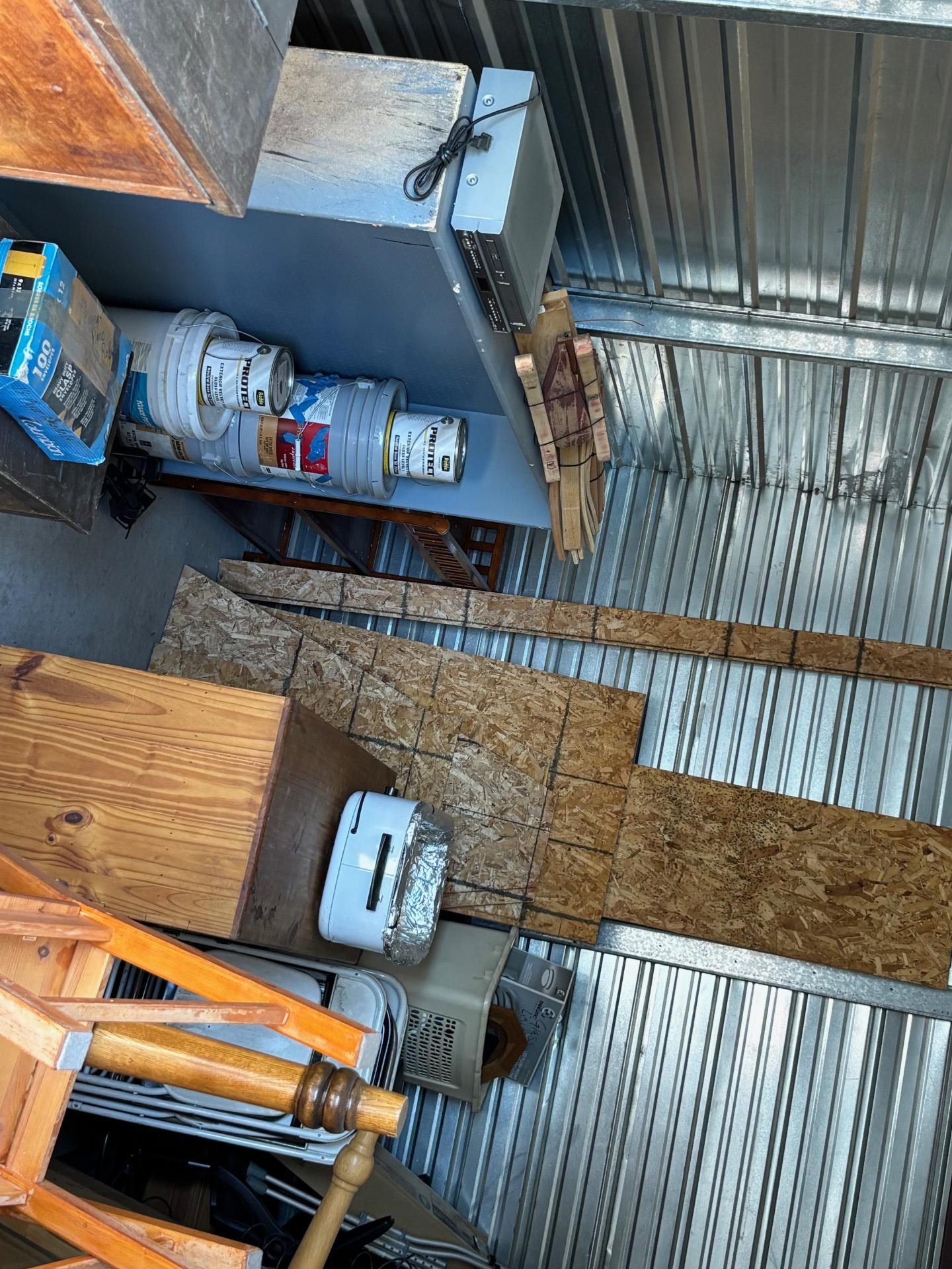 This unit appears to contain…Player Piano w/rolls & bench, Air Compressor(Porter Cable), cordless drill, dvd/vcr, cooker, dust buster, mailbox, sink, tire, furniture, tables, chairs, lamp, mattresses, crutches, floor padding, lights, door hardware, paint, pressboard