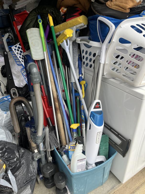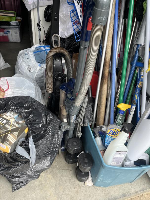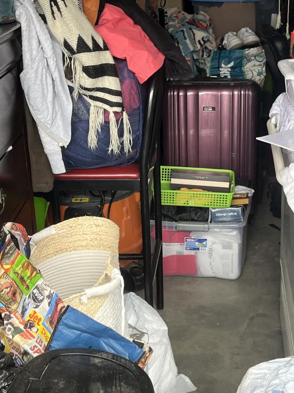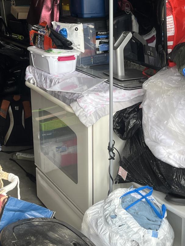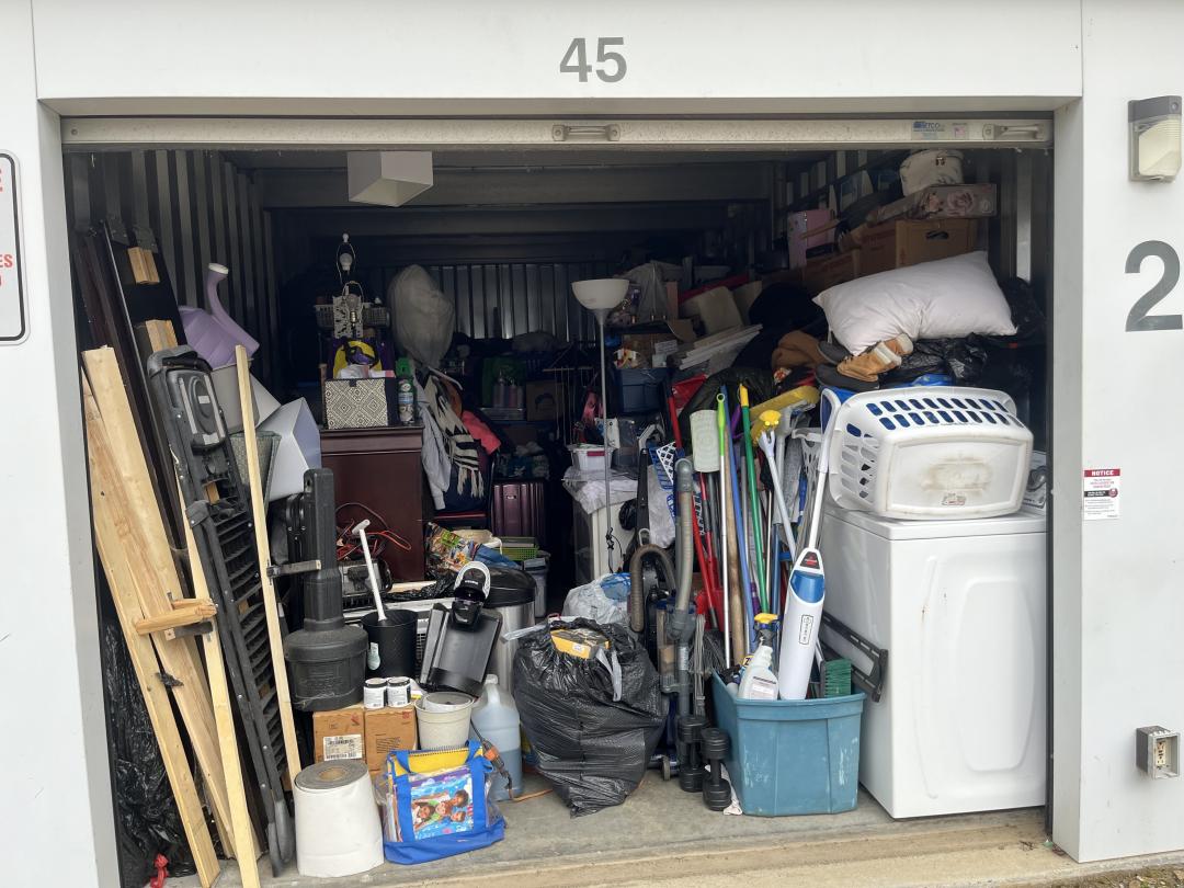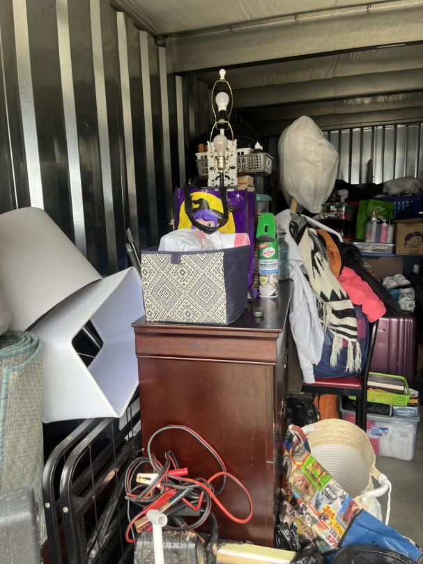 This unit appears to contain…Unit appears to contain, furniture, vacuum, luggage, stove, dryer, lamps, clothes, baskets, personal items, much more