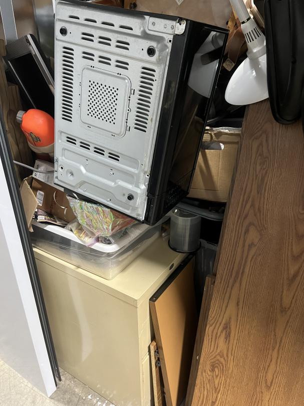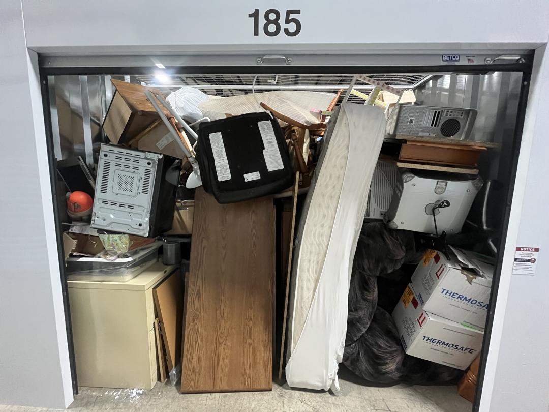 This unit appears to contain…Unit appears to contain, mattress, computers, window ac, file cabinet, furniture, chairs, mini fridge, boxes, totes