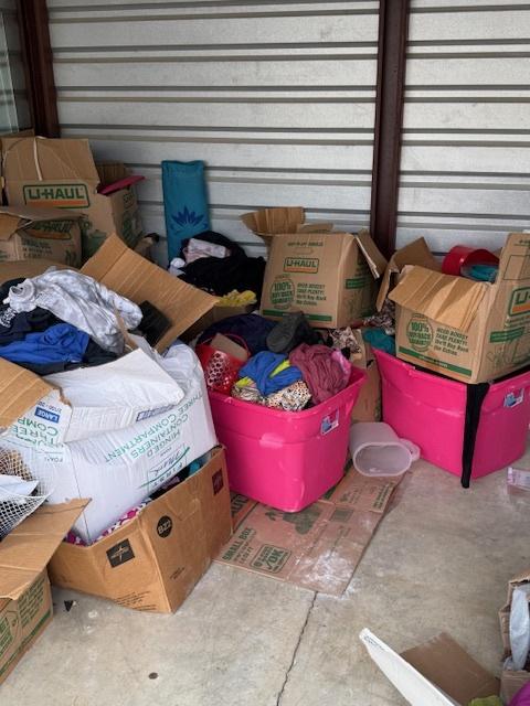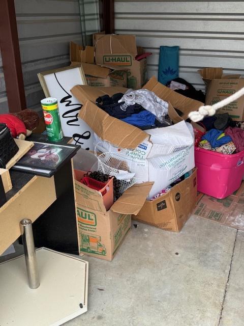 This unit appears to contain…This unit appears to contain: boxes, totes, clothes, shoes, table, and other misc items.