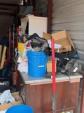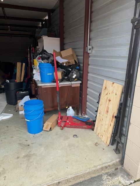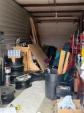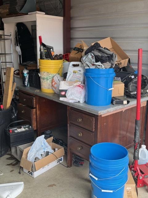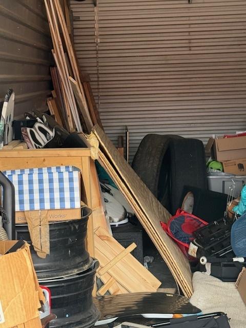 This unit appears to contain…This unit appears to contain: tires, wheels, buckets, car jack, carpet, desk, plywood, vacuum, canvas, garbage can, battery, metal rack, boxes, totes, table, dolly, wood cabinet, and other misc items.