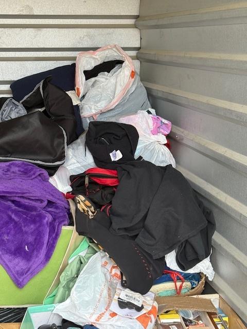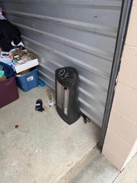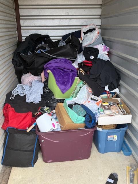This unit appears to contain…This unit appears to contain: space heater, clothes, totes, bags, blanket, baseball cards, and other misc items.
