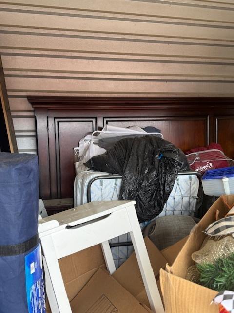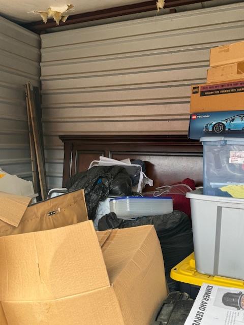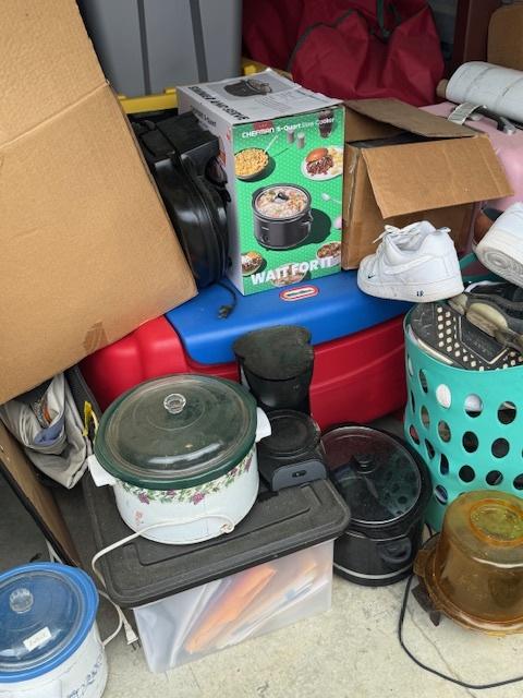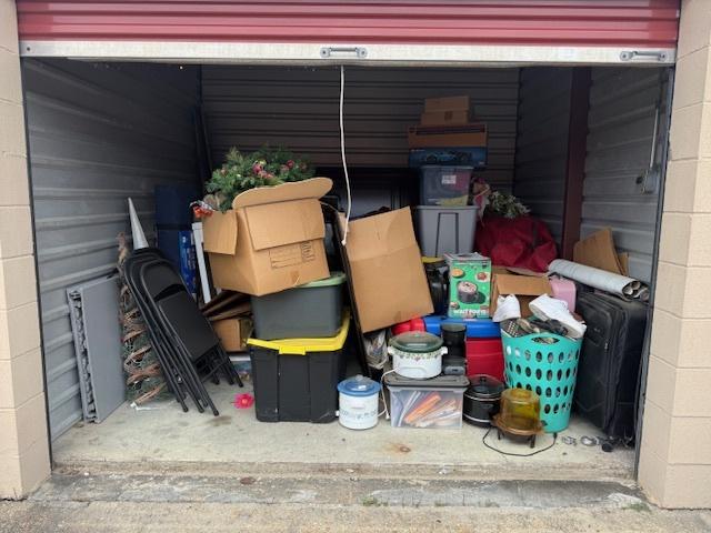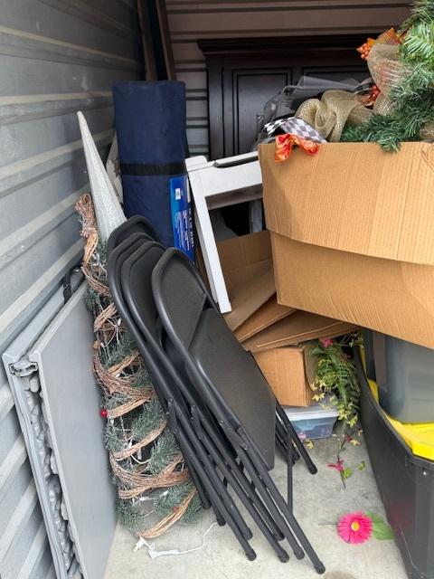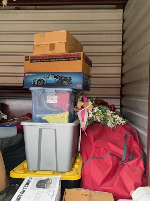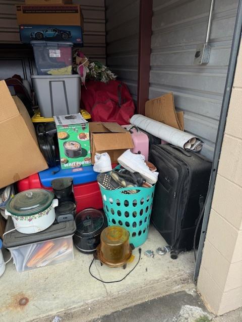 This unit appears to contain…This unit appears to contain: boxes, totes, suitcases, crockpots, toy box, folding table and chairs, christmas decorations, clothes hamper, shoes, clothes, bed frame, bags, folding bed, and other misc items.