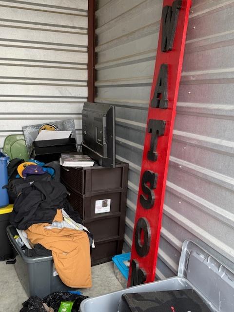 This unit appears to contain…This unit appears to contain: totes, clothes hamper, tv, plastic organizers, clothes, boxes, and other misc items.
