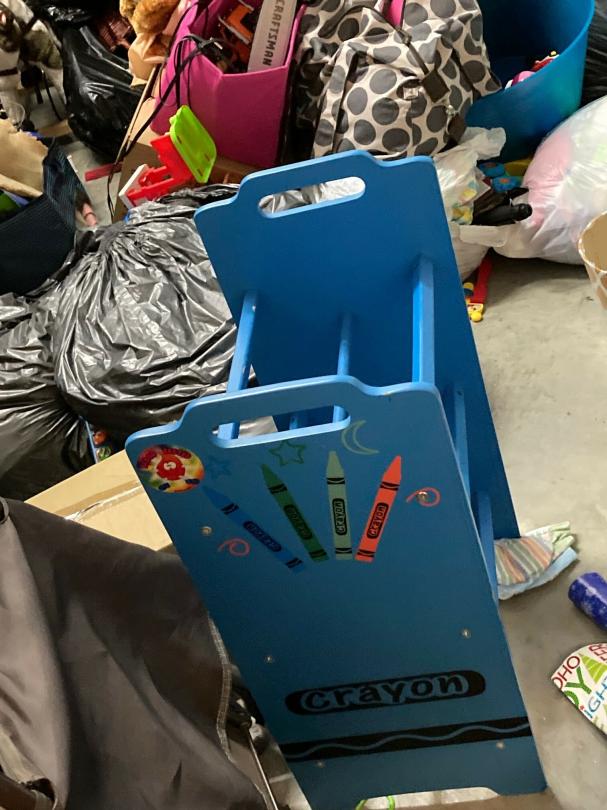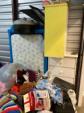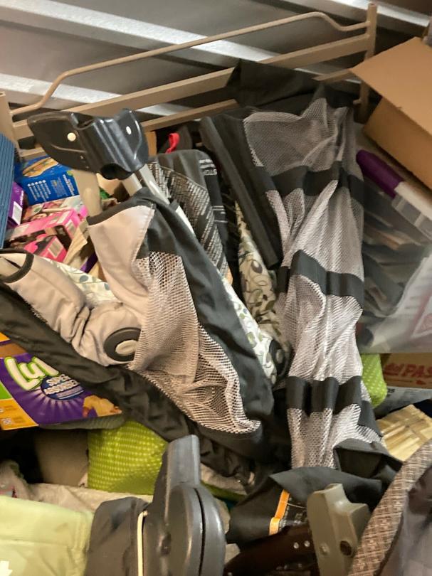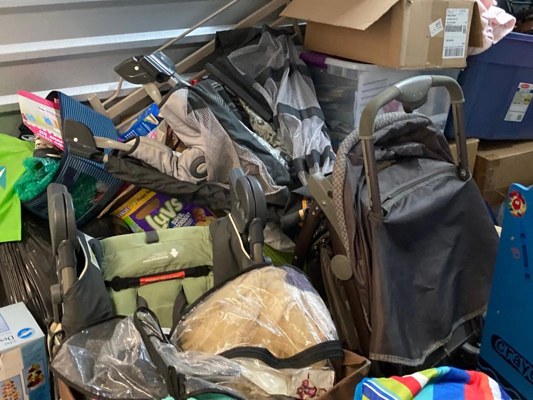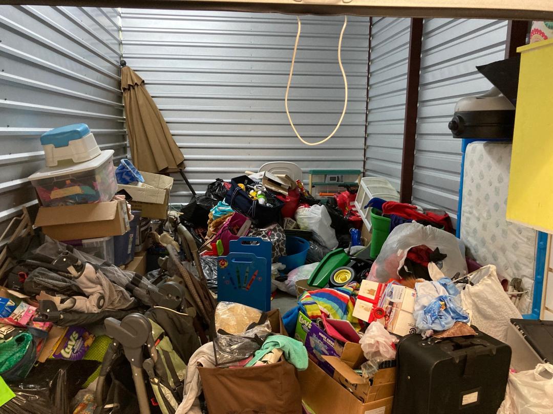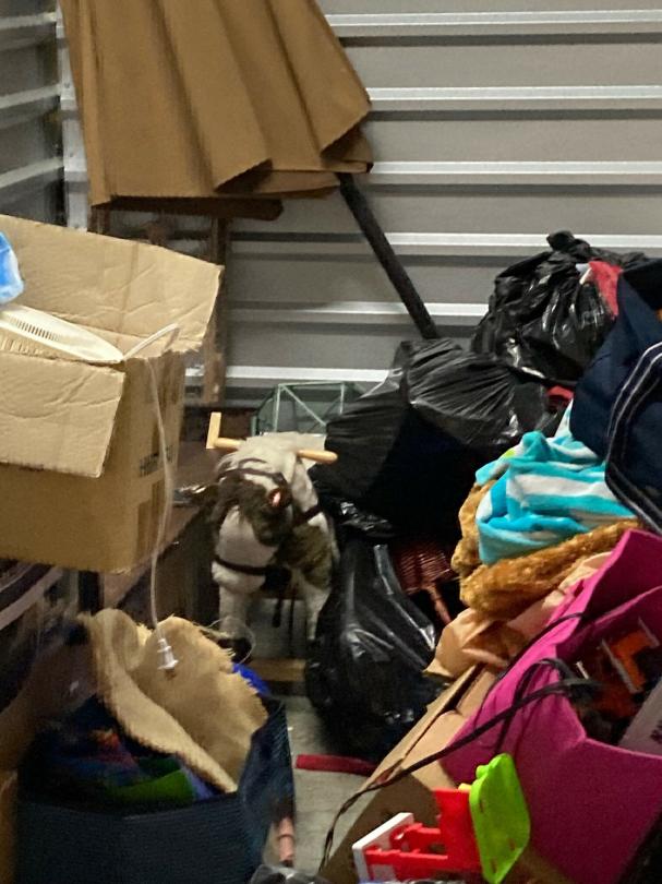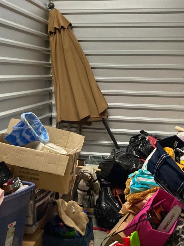 This unit appears to contain…climate control: 2 baby strollers, child dresser, toddler bed, clothes, child basketball goal, patio umbrella, bookcase, pack-N-play, toy 4-wheeler, bags, boxes, luggage, play kitchen, rocking horse, baby gate, plastic organizer/drawers