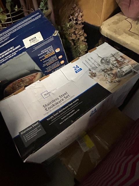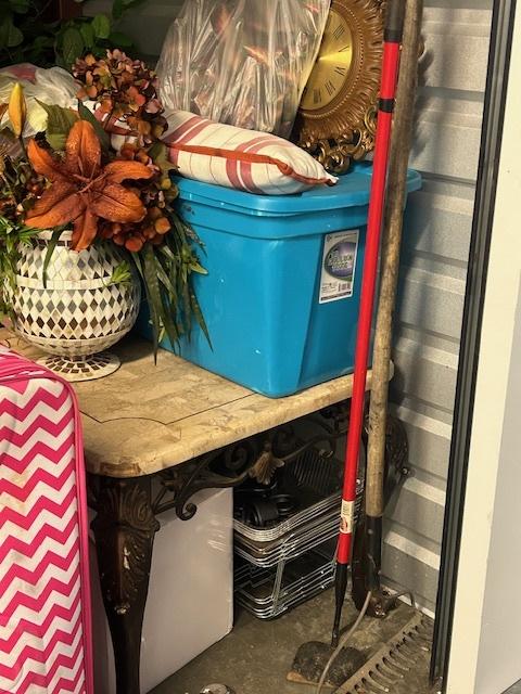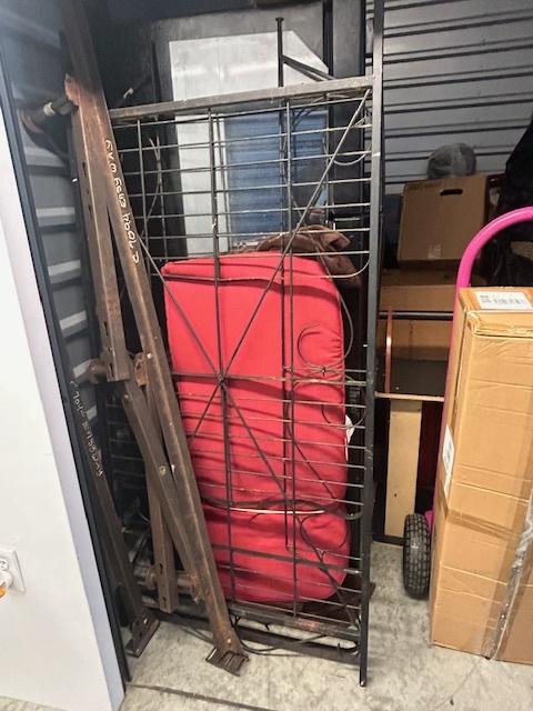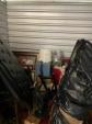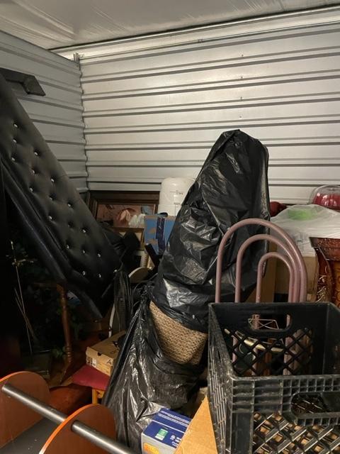 This unit appears to contain…GE refrigerator, luggage, yard tools, vases of flowers, artificial trees, area rug, pink moving dolly, baker's rack, shelving, clock, King size leather headboard, Christmas tree, night stand, trunk, 24 pc. cookware, glass table, wall art and Oster electric 12 inch skillet.