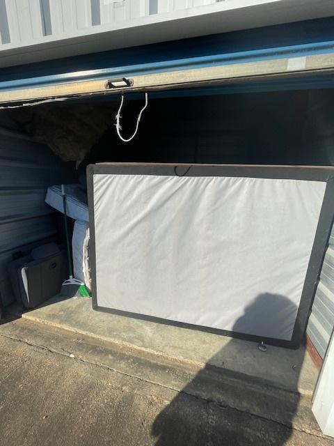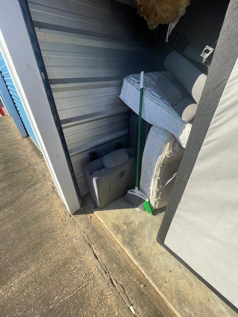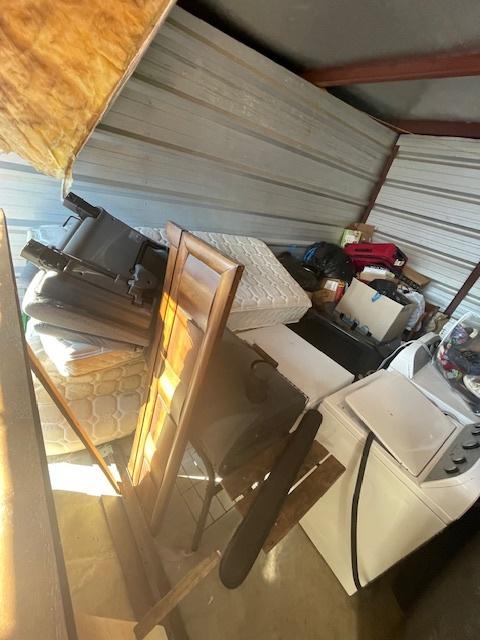 This unit appears to contain…Queen box spring and mattress, suv/truck seats, washer/dryer, luggage, grill, shoe rack, 2 twin mattresses, household cleaning supplies/tools, misc boxes and totes.