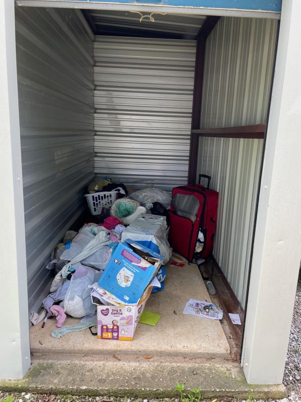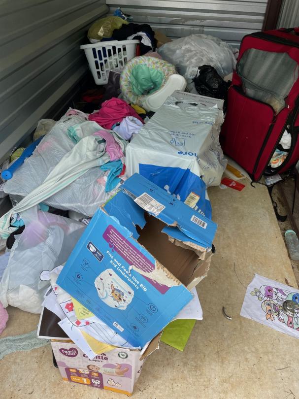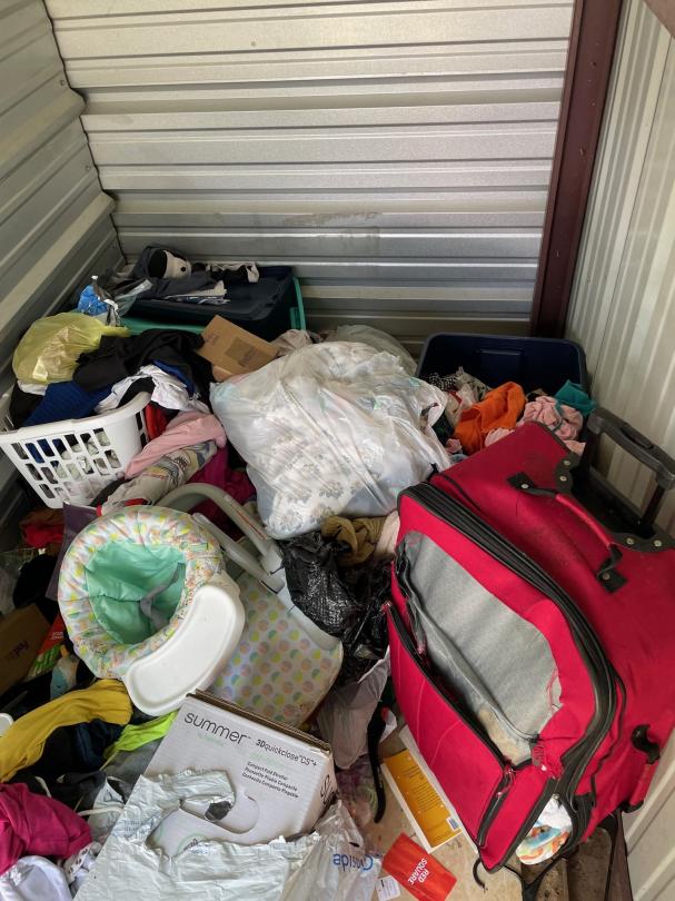 This unit appears to contain…drive up: clothes, walker, bags, luggage, boxes