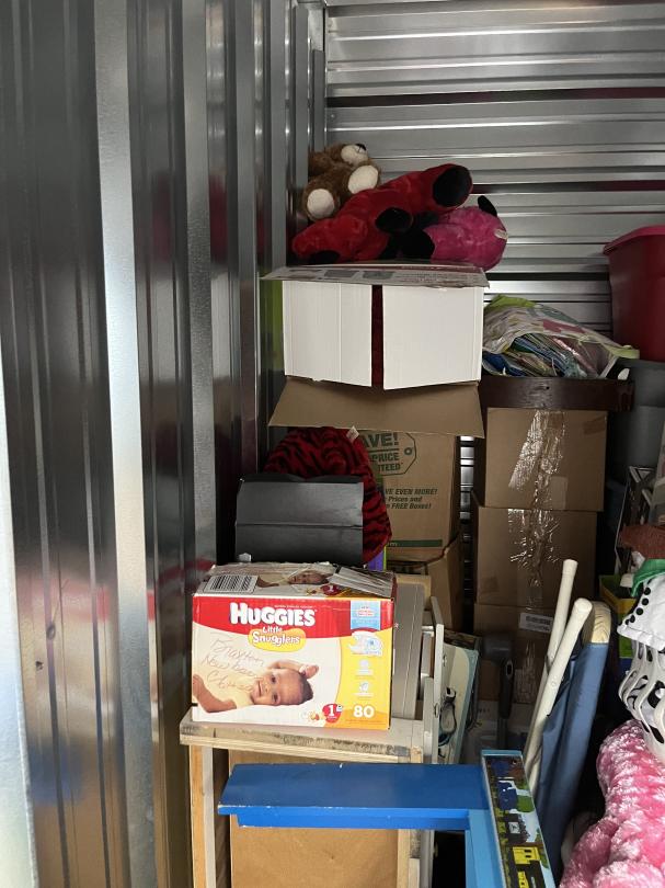 This unit appears to contain…climate controlled end table, chair, train table, drum, clothes baskets, boxes, bags, toaster oven