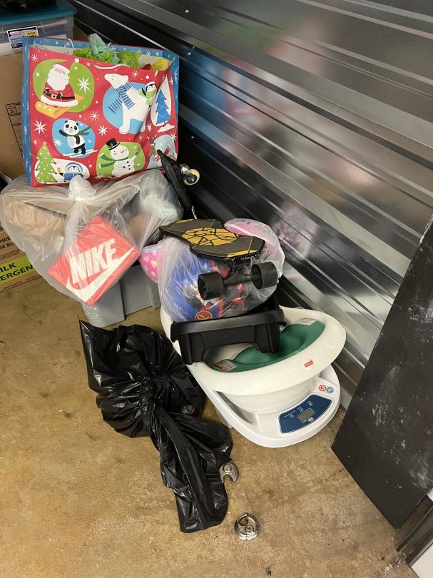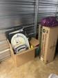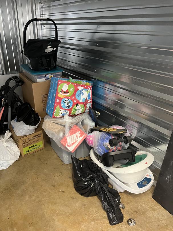 This unit appears to contain…climate controlled baby furniture, boxes, baby bathtub, shelf, folding table, strollers, wood slats.