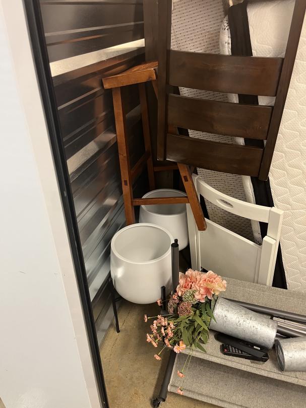 This unit appears to contain…climate controlled mattress, box springs, chairs, home decor, stool, dryer, bed frame, tv, twin bed