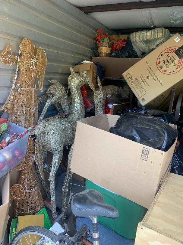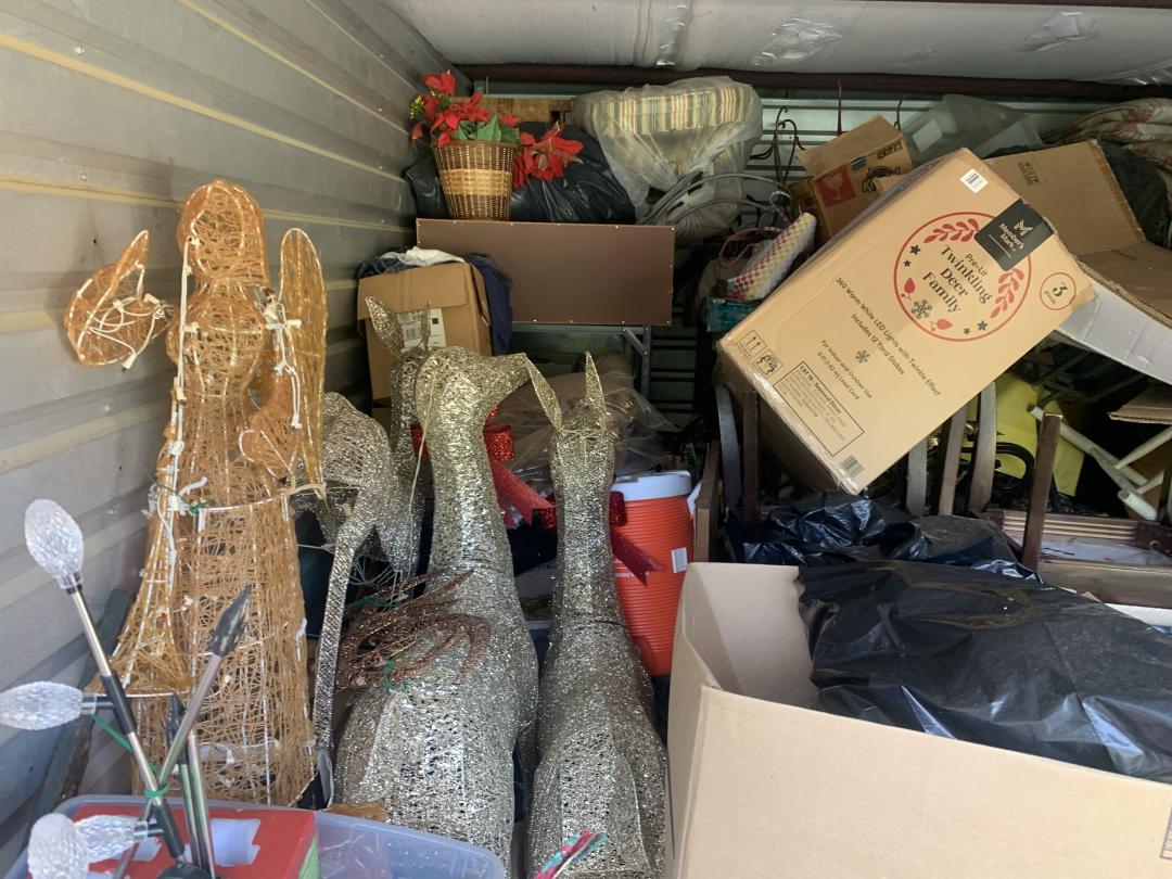 This unit appears to contain…Unit Contains: 2 Mountain Bike Christmas Decor Yard Luggage Home Decor Rocking Chair Car Seats Golf Clubs Chairs End Tables Patio Cushions Misc Totes