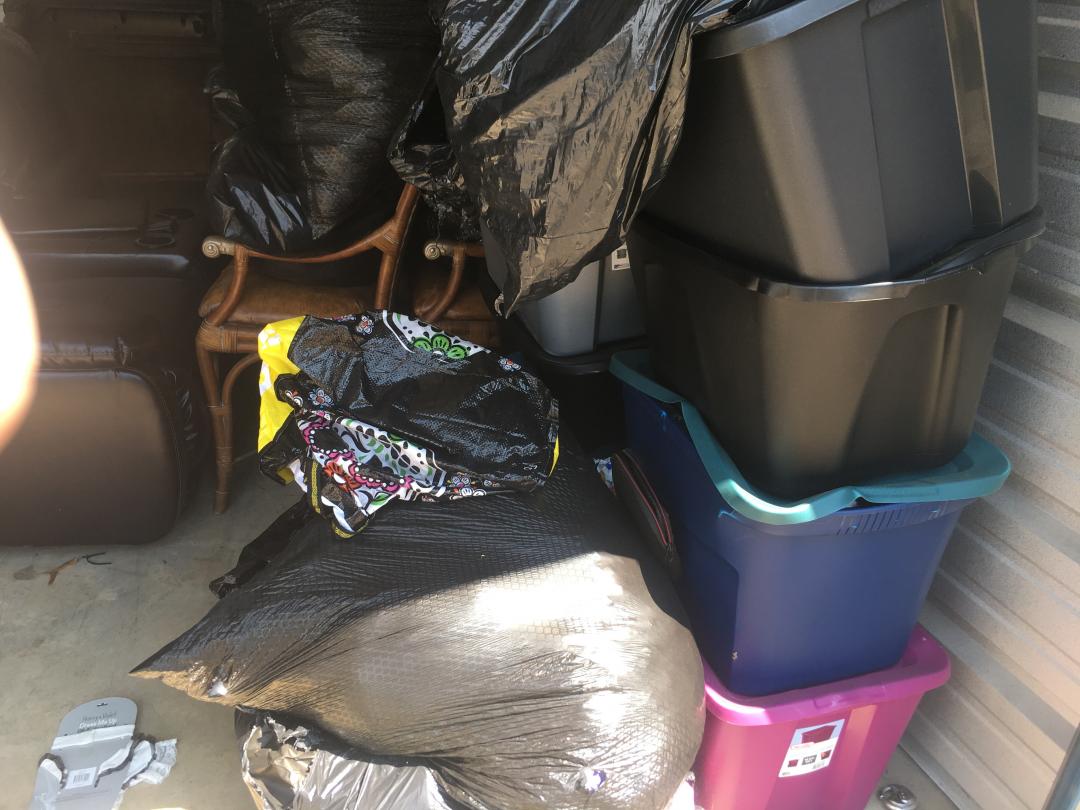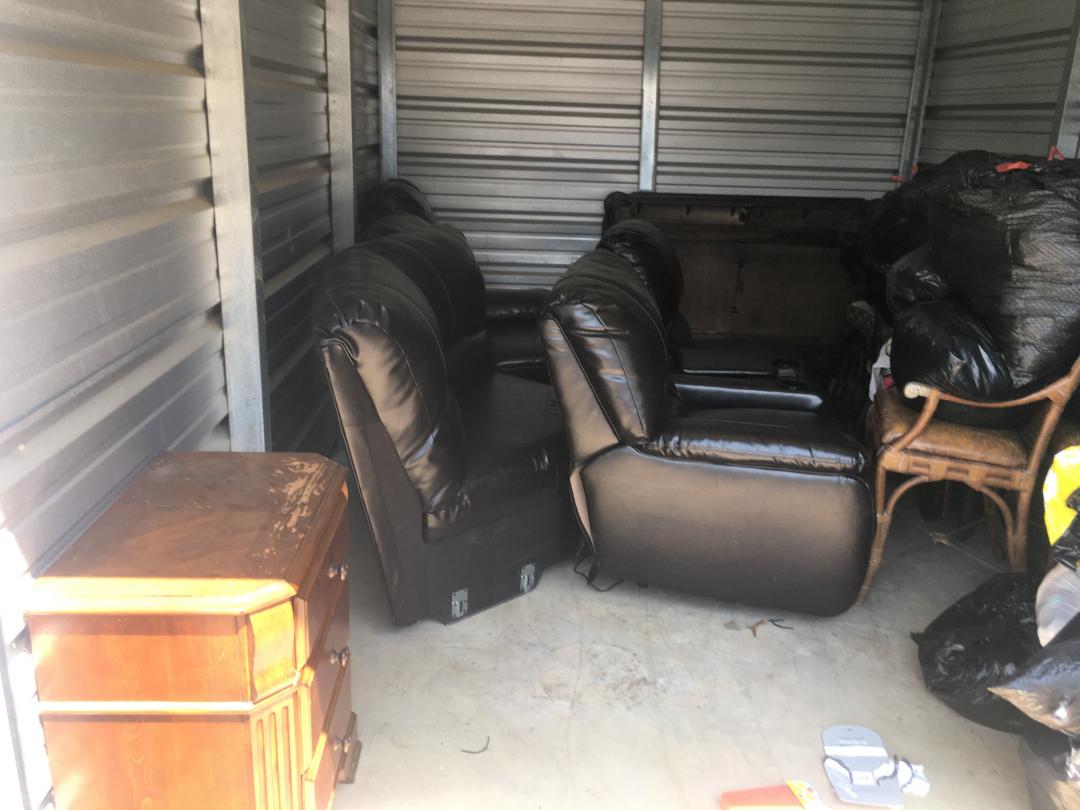 This unit appears to contain…dining table and chairs, sectional, totes, bags, nightstand.