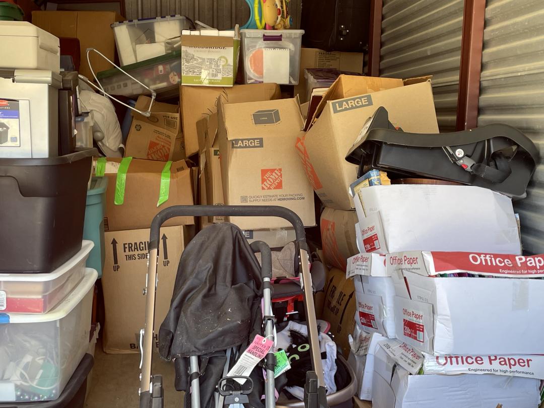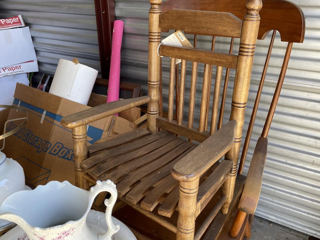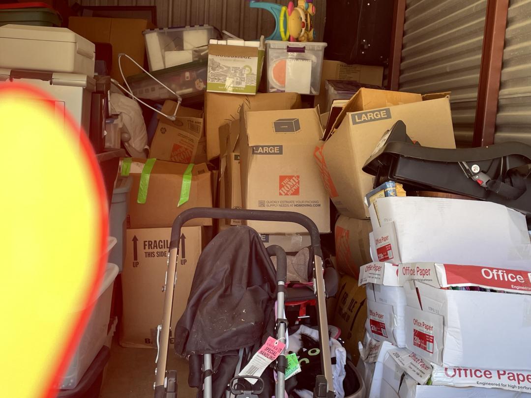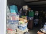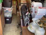 This unit appears to contain…child rocking chair, rocking chair, stroller, car seat, baby bouncer, baby walker, coffee table, nightstand, china cabinet, table lamp, water picture and bowl, suitcases, fire lockbox, wall art, wall pictures, books, Christmas decorations, 2 filing boxes, miscellaneous totes, miscellaneous boxes