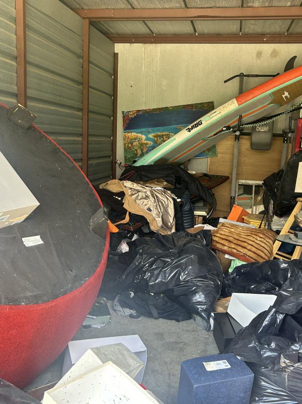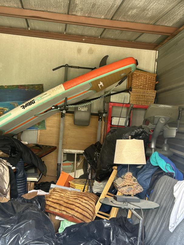This unit appears to contain…Couch, Artwork, bags, paddleboard, exercise equipment, shelving, clothes, baskets