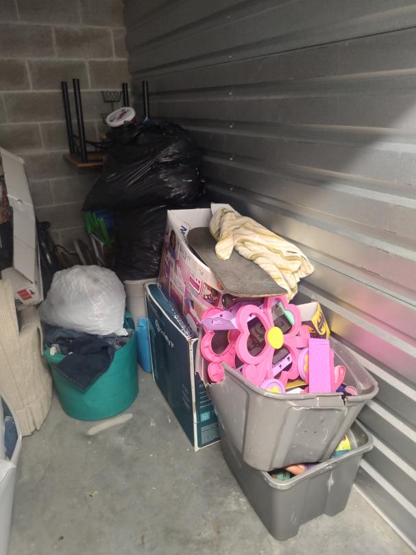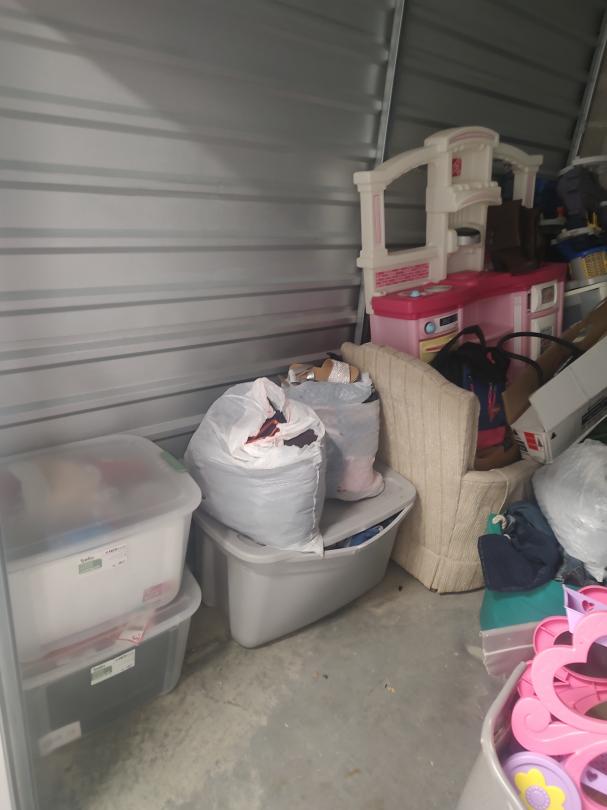 This unit appears to contain…totes x-mas tree kid toys kids kitchen set mirror chairs pillows purses tables Shelf picture frame skate board organizers bags boxes bug sprayer book bags shoes love seat children's back pack
