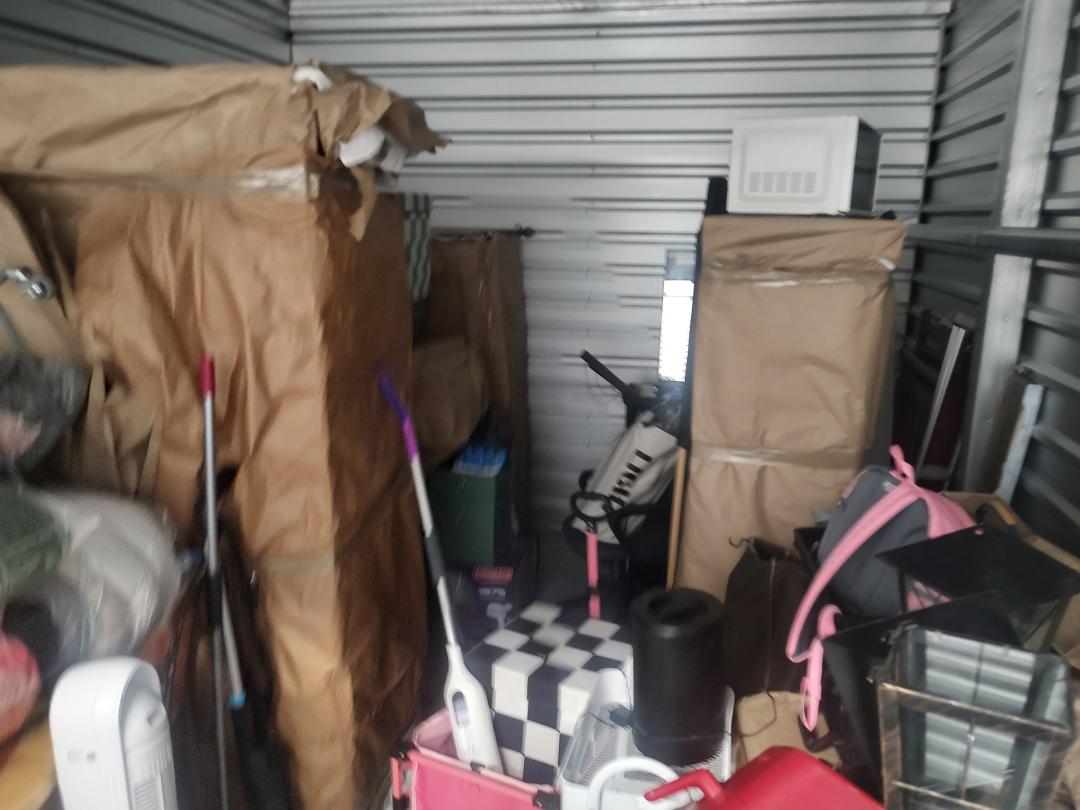 This unit appears to contain…coffee table mirror large 2 chairs round table baby matress boots crock pot warmer boxes several peices of large wooden furniture baby slay bed iron sconces crutches small suitcases tv flatscreen misc. totes Bedding air fryer large dresser kids toys rolling carts clothing microwave