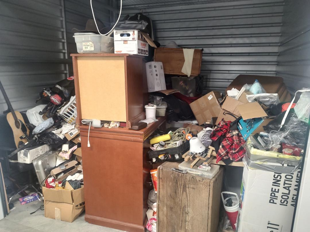 This unit appears to contain…Wrapping Paper targets end table acoustic guitar (2) shelving desk chair misc. totes and boxes clothing fishing poles & reels Hat