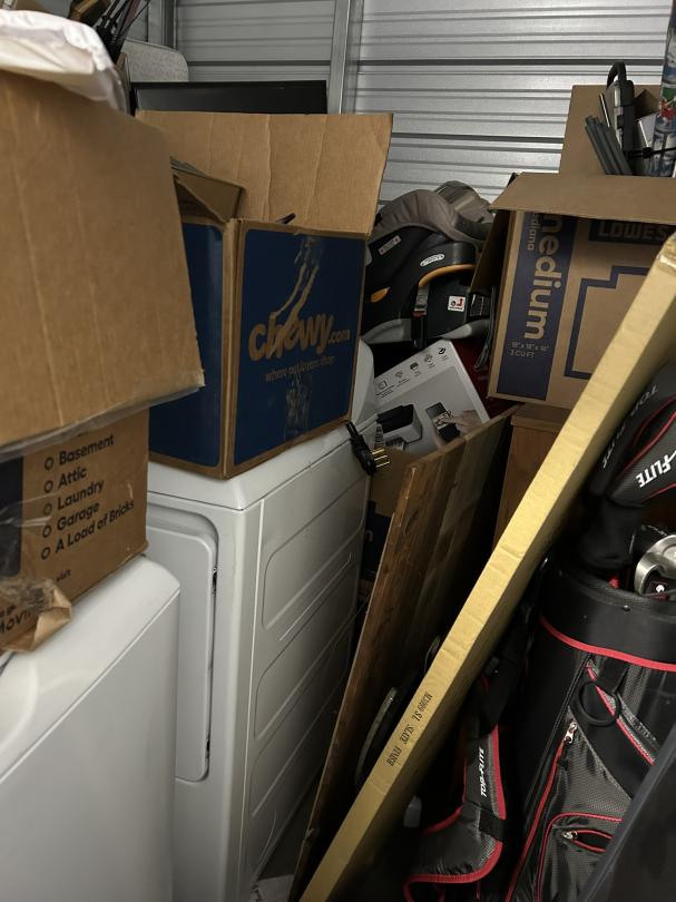 This unit appears to contain…Bag, Box, Washer, Dryer, Fishing Pole, Bow, Golf Clubs, Speaker, Stool, Stroller, Wall Art