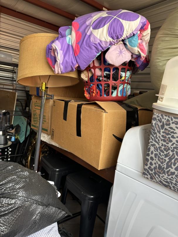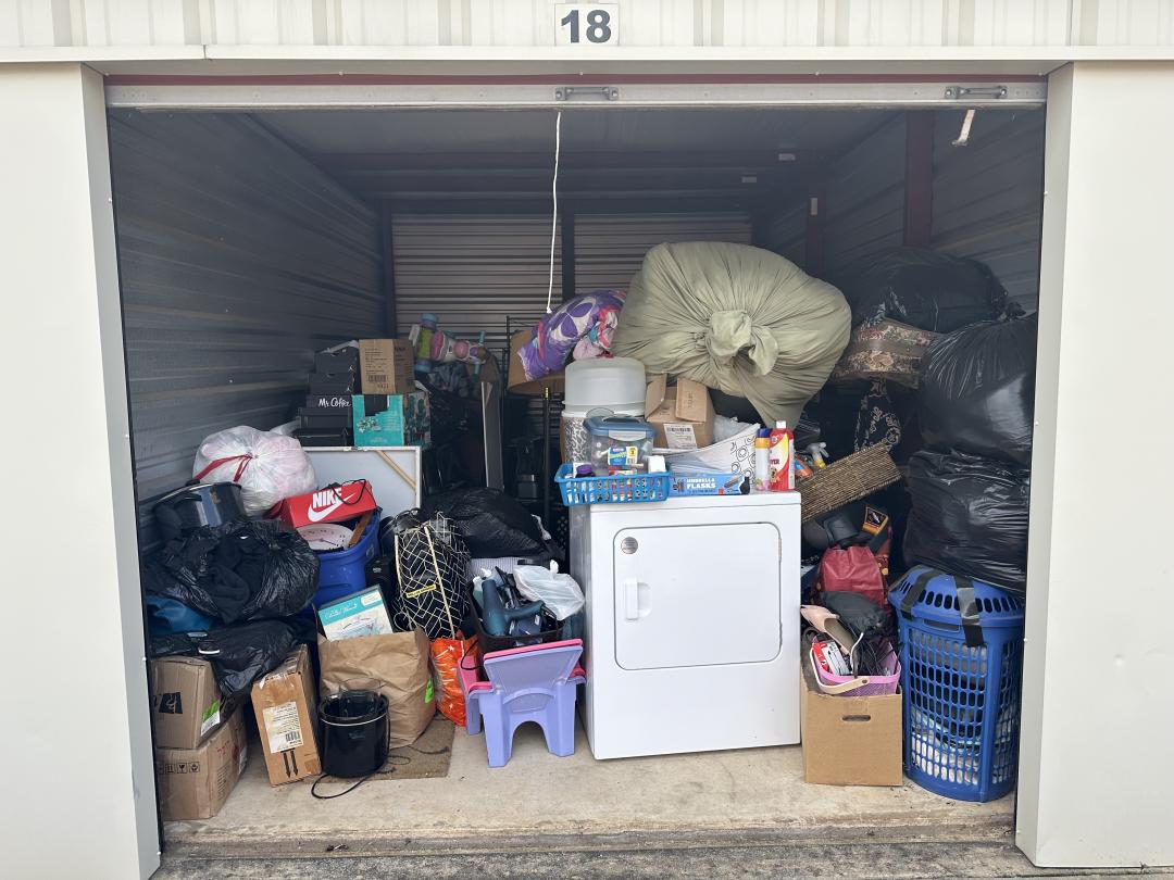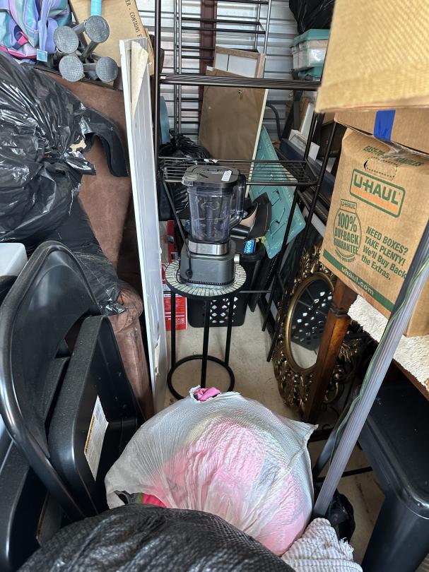 This unit appears to contain…Washer, Shoes, Clothes, Kitchen Ware, Shelves, Folding chairs, furniture, boxes, crock pot, toys, luggage