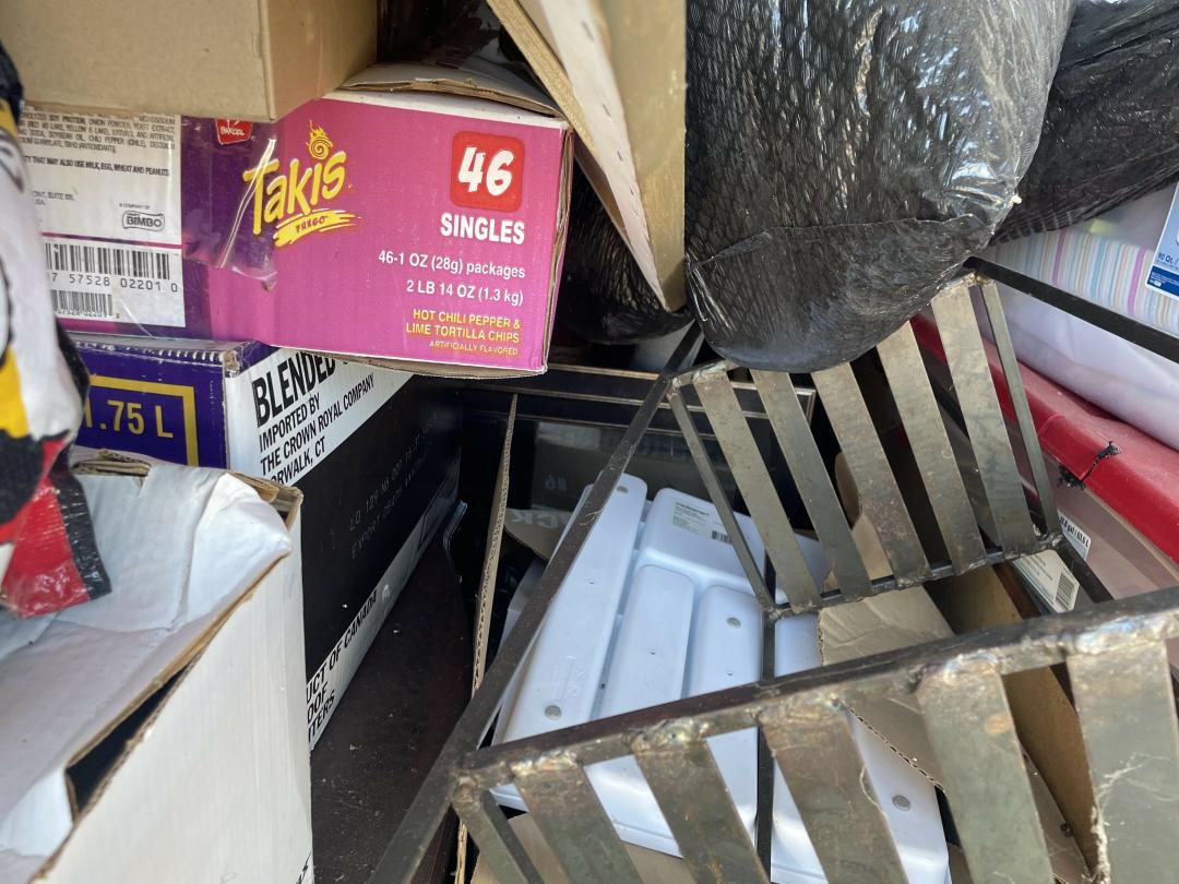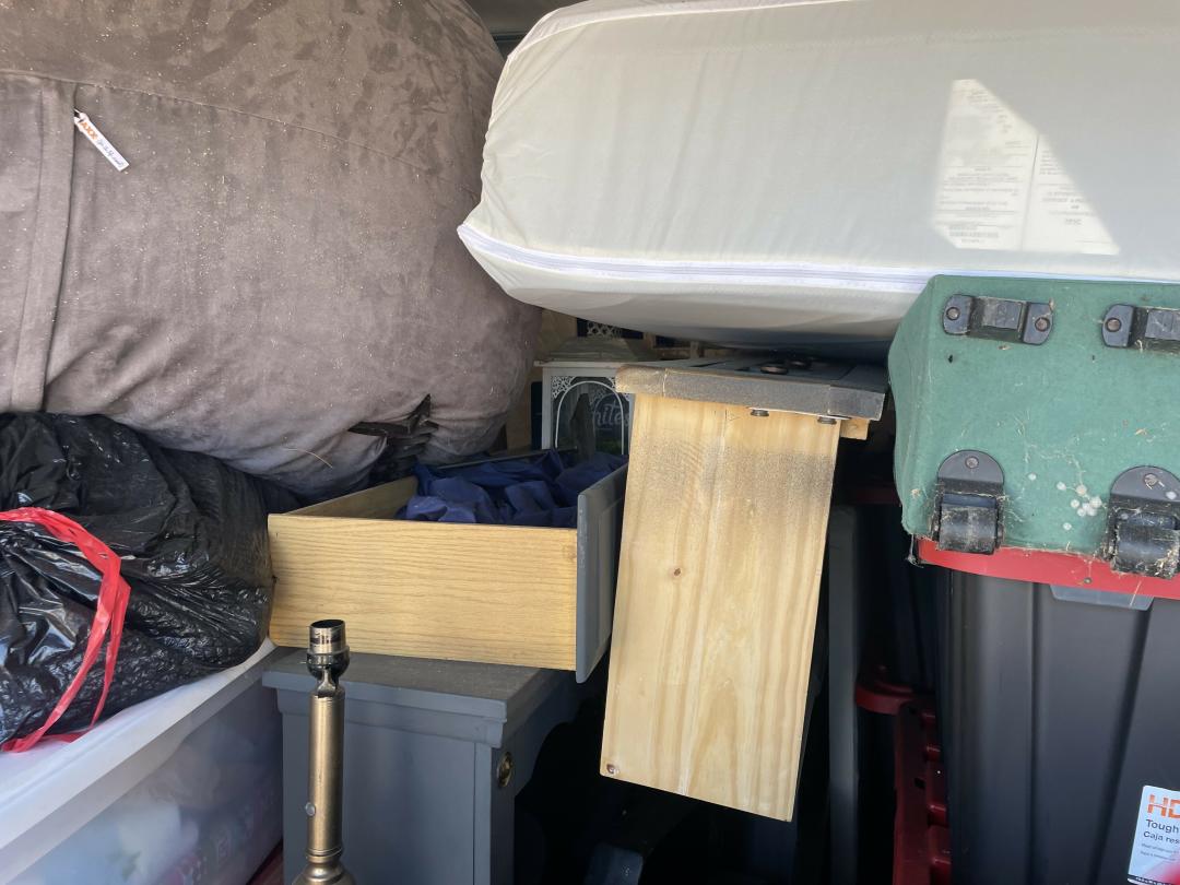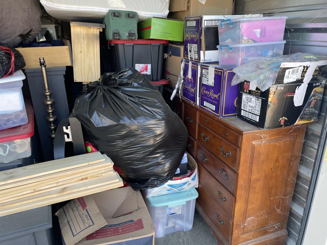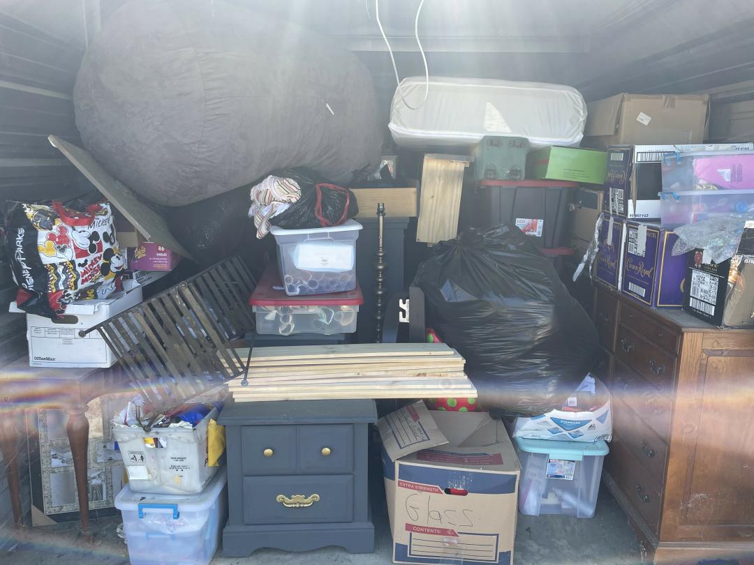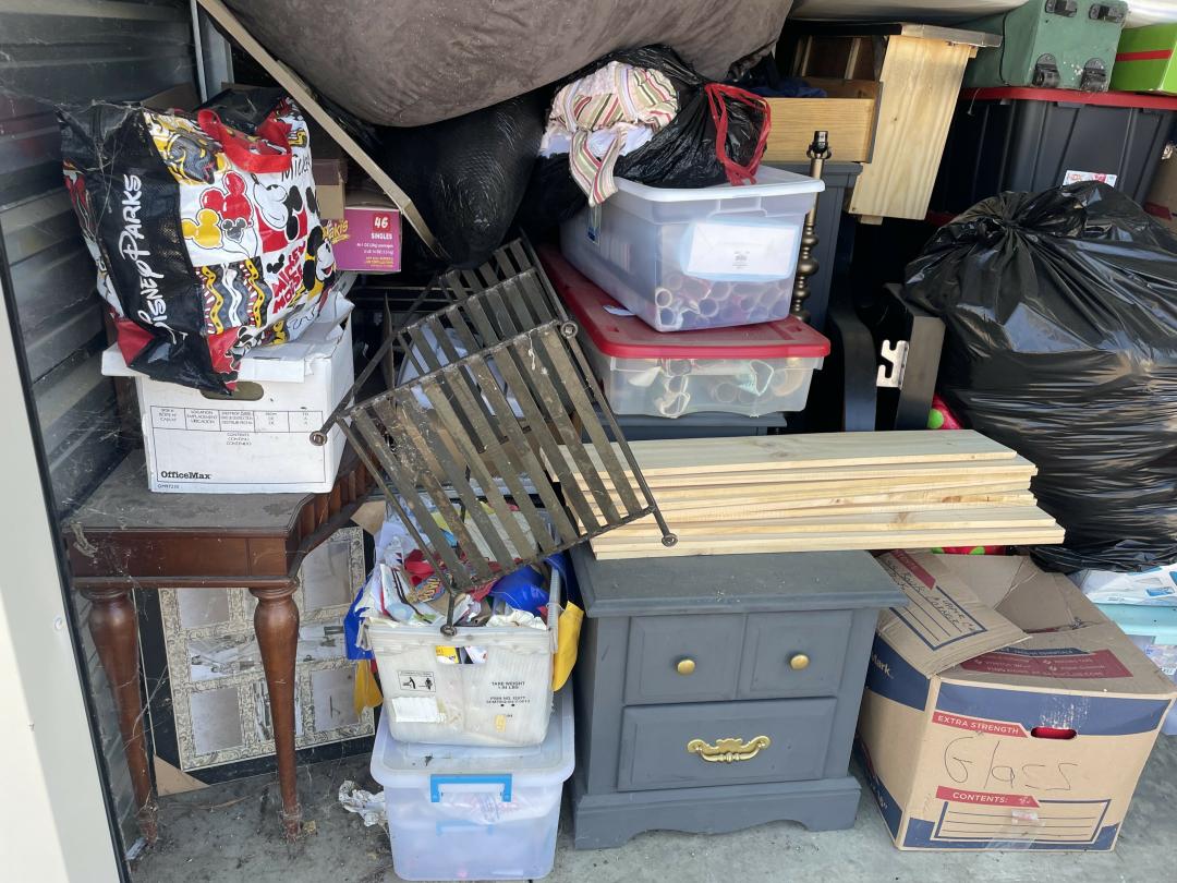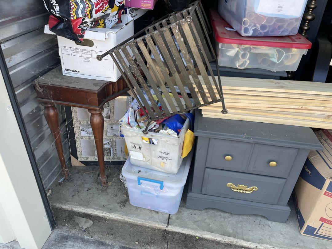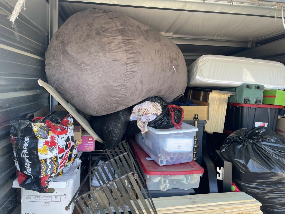 This unit appears to contain…Dresser, Misc Boxes, Misc Bags, Misc Totes, Large Beanbag, Twin Mattress, Bed Frame with Woodend Slats, Floor Lamp, Metal Shelf, Decorations, Foyer Table, Artwork, Tent, Dresser with Hutch.