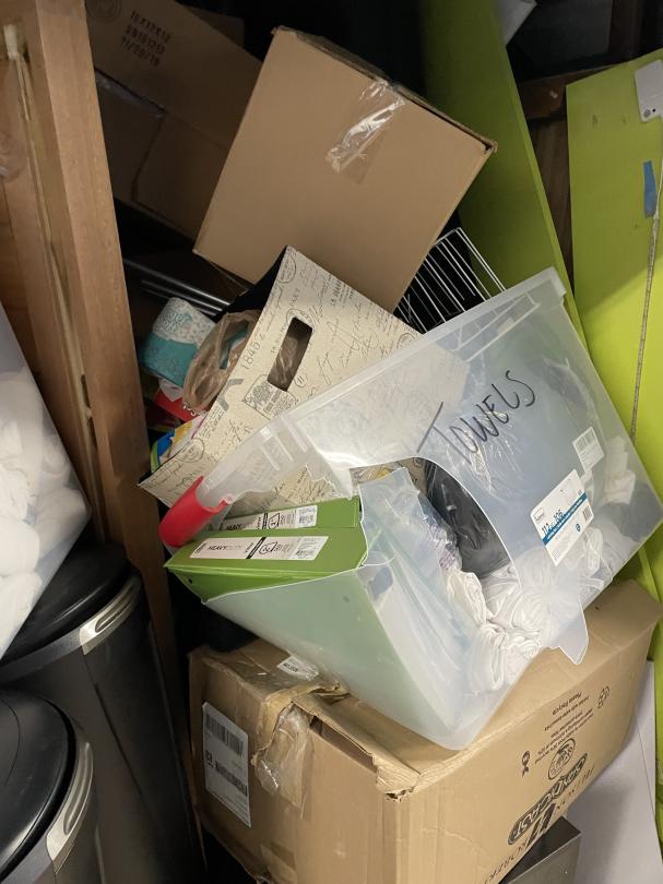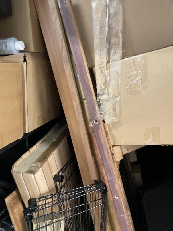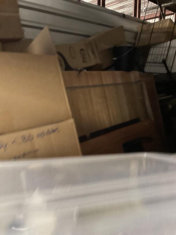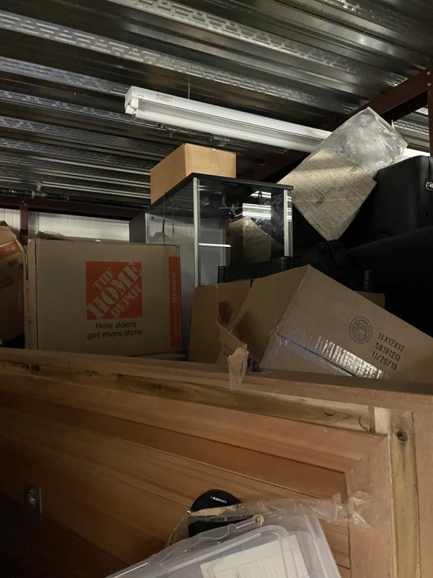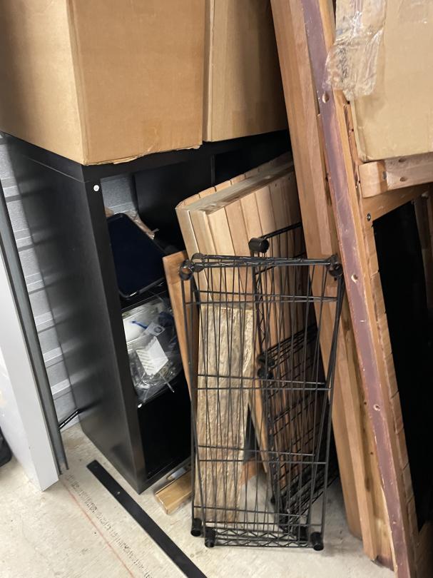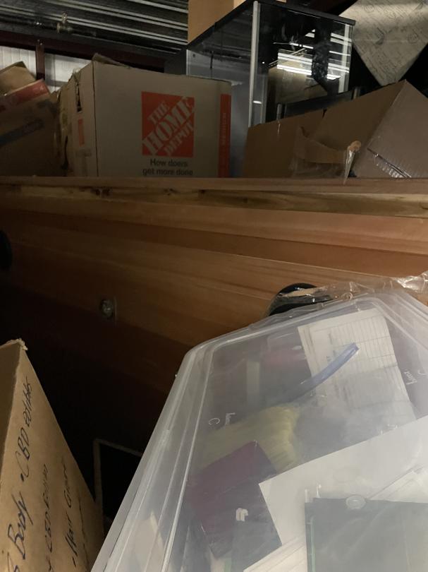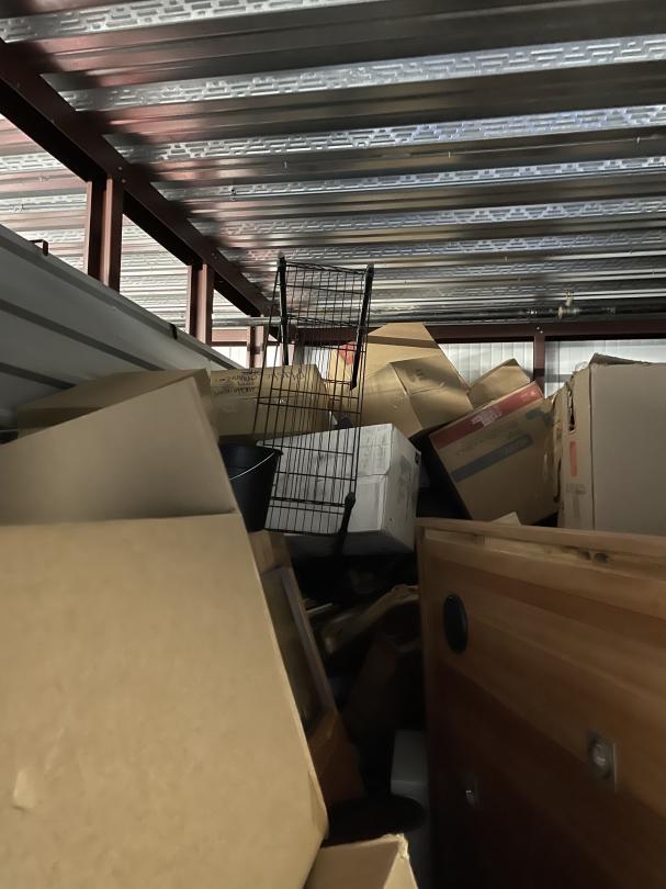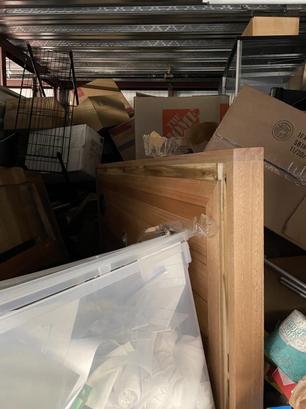 This unit appears to contain…Misc Boxes, Water Coolers, iPad, Glass Case, Bookcase, Headboard, Metal Shelf, Rails.