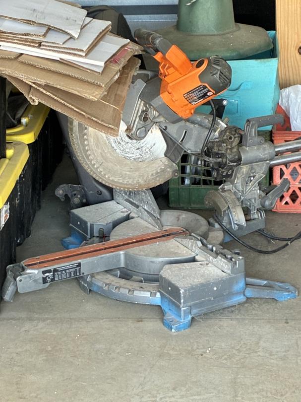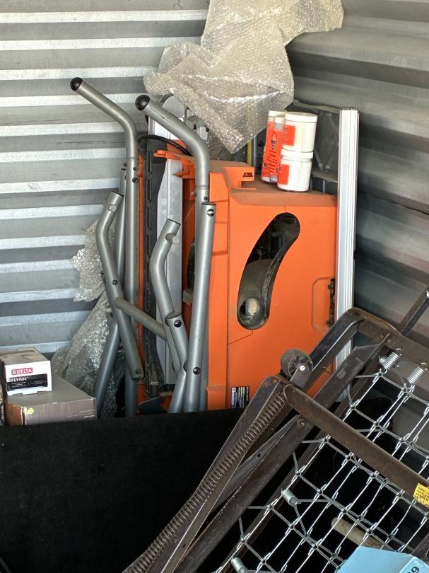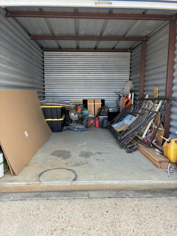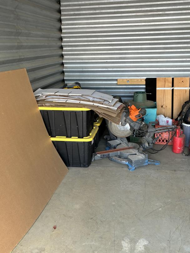 This unit appears to contain…miter saw table saw battery booster (2) (5) gas cans Twin headboard/footboard bedframe (4) solar4 panels misc totes backpack