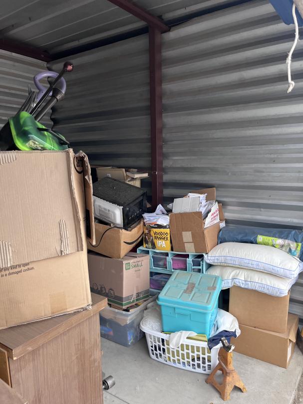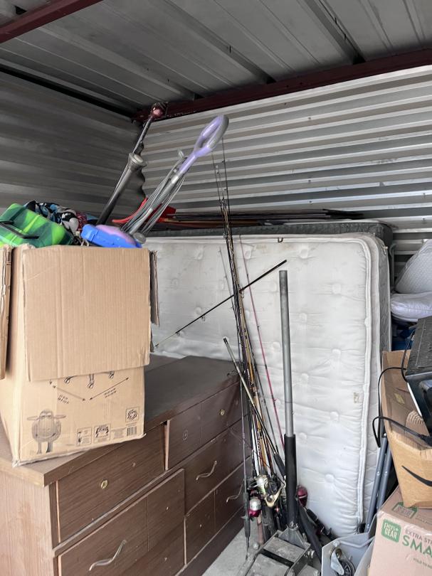 This unit appears to contain…bOXES, MATTRESS, FISHING GEAR, DRESSER, BOWS, FLOOR JACK, MICROWAVE, WALL ART, YARD TOOLS, CAMPING GEAR