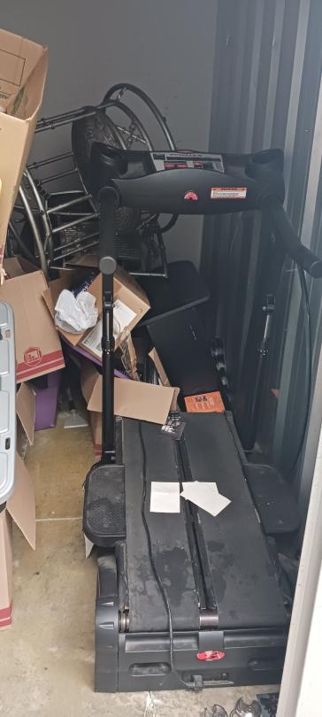 This unit appears to contain…TREADMILL, BOXES, TOTES, TABLE, CHAIRS
