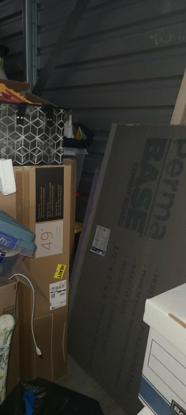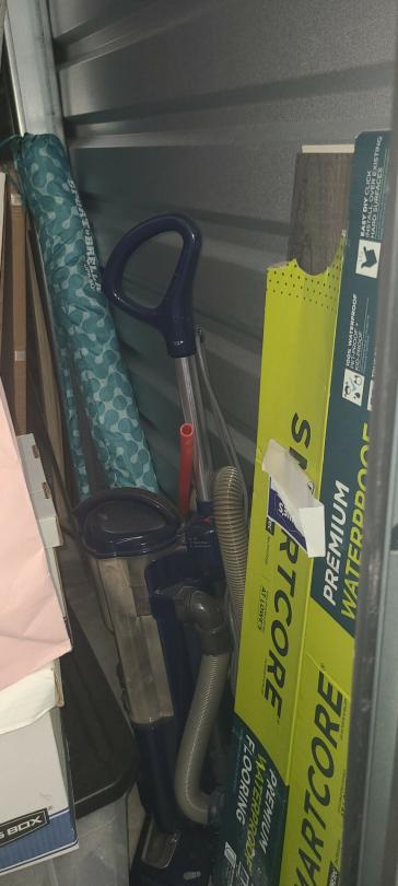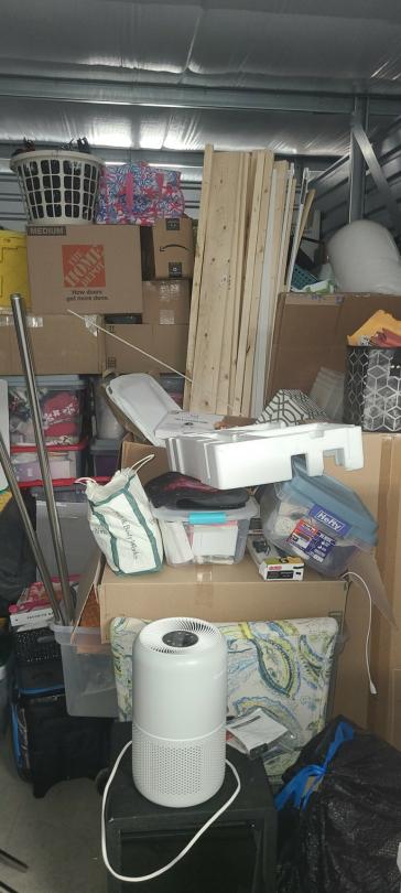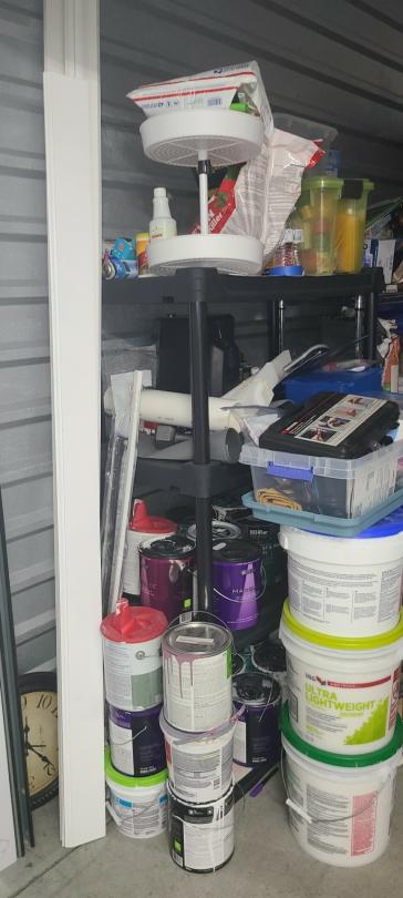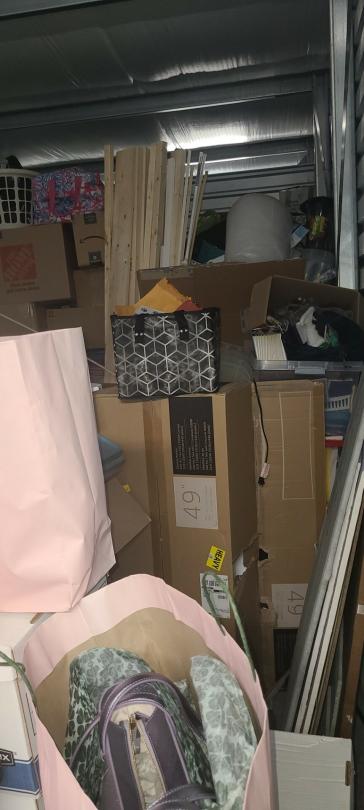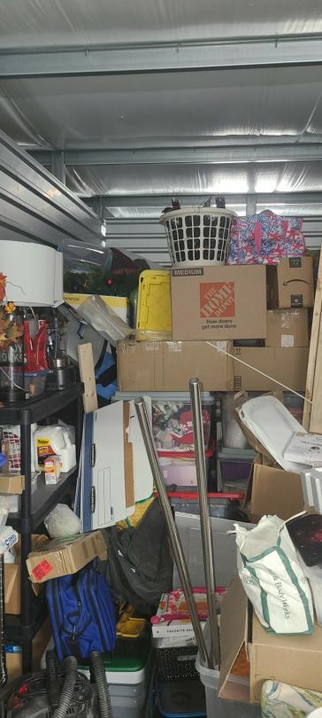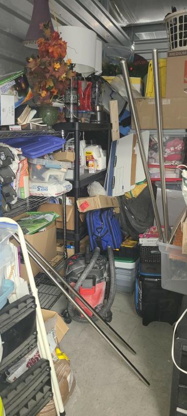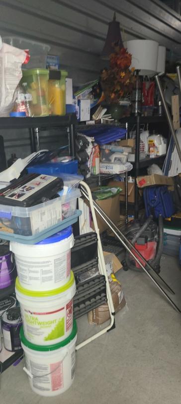 This unit appears to contain…Tools, construction supplies, painting supplies, landscaping equipment, shelving, lamps, decor, plastic bags, plastic containers, misc. boxes, suitcases, laundry baskets, purses, artwork, misc. items, safe, shop vac, metal poles, loose wood.