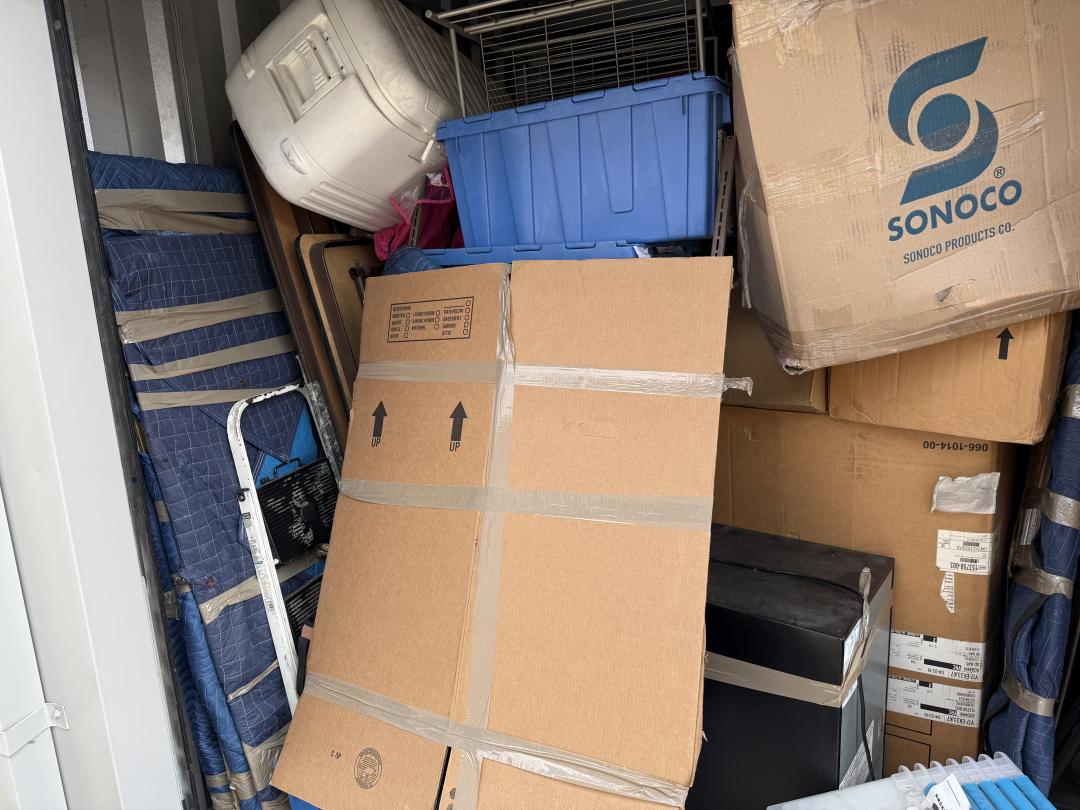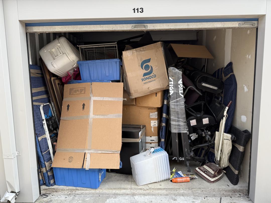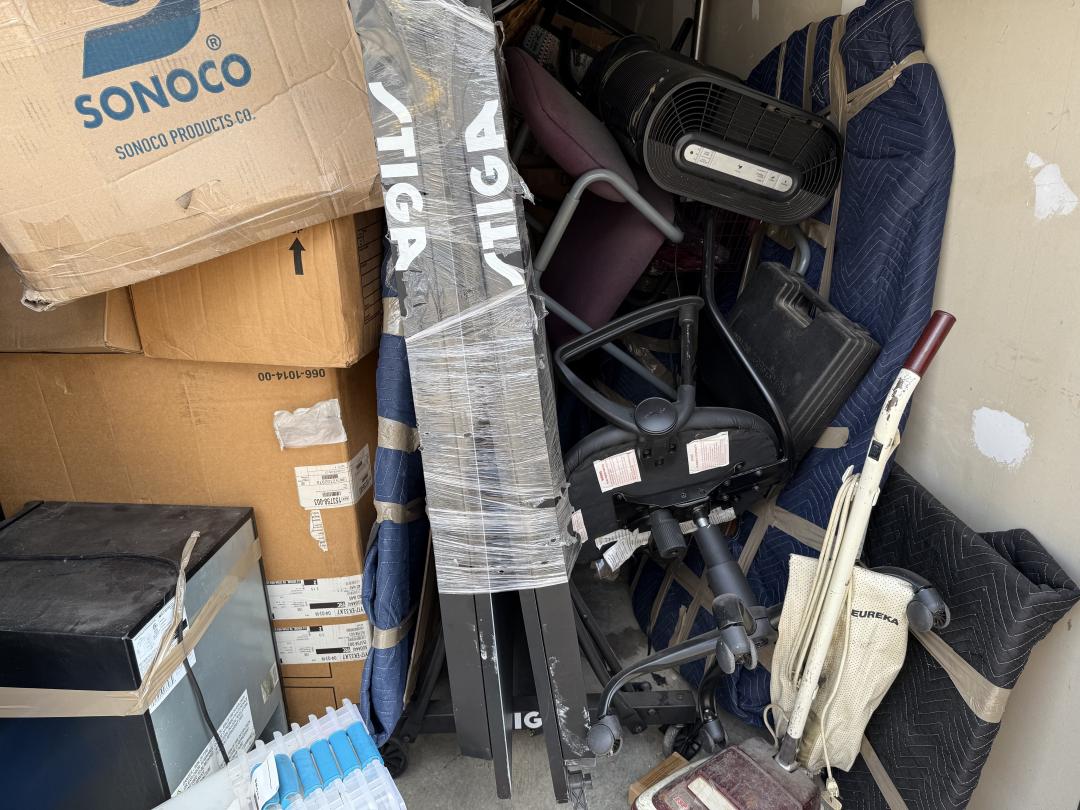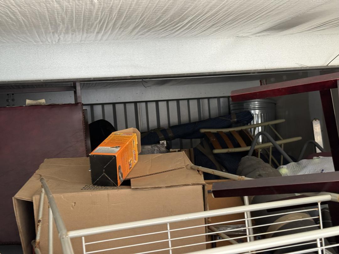 This unit appears to contain…This unit appears to contain boxes, chairs, totes, tables, a ladder, and a vacuum.