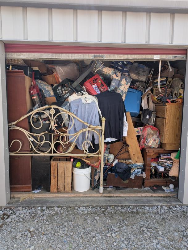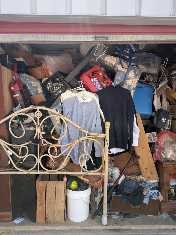 This unit appears to contain…Bed frame, boxes, totes, Clothes, Shoes, old baseball cards, sofa, dresser, several shelves and end tables, at least 2 vacuums, wall decor. , DVD's and CD's, dress clothes, Whole box of glassware, at least four walking canes of different design, and a broom.