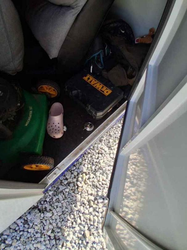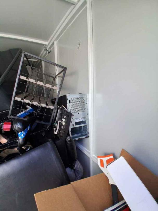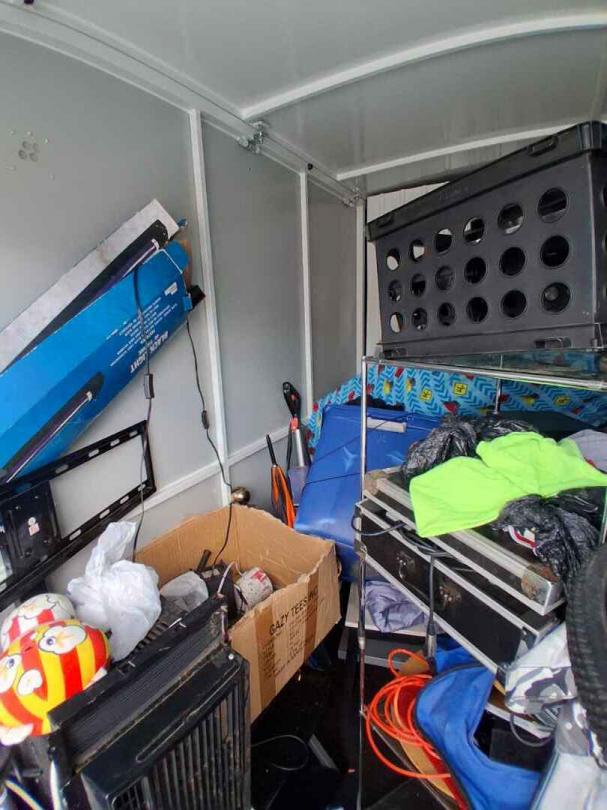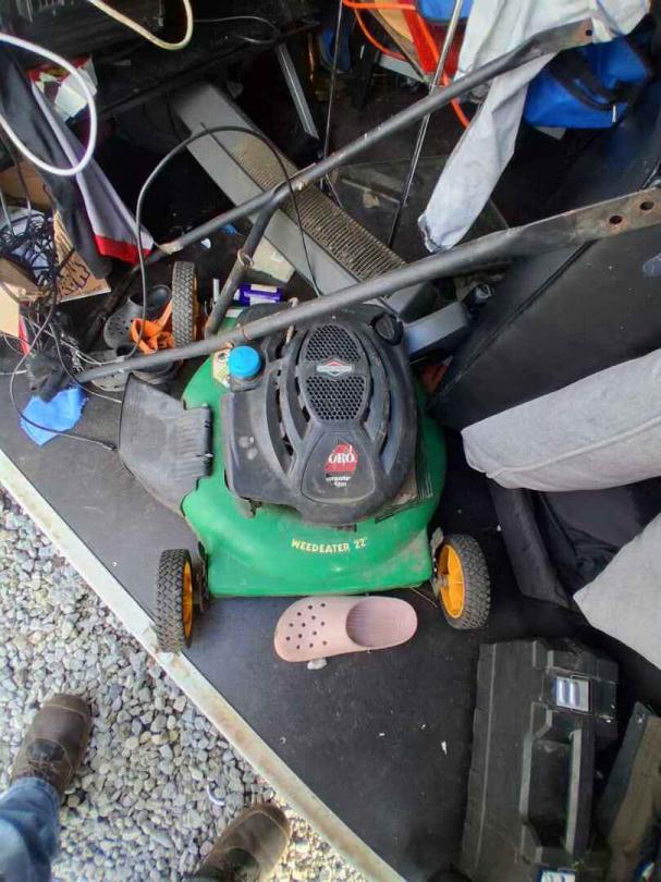 This unit appears to contain…24/7 Access, Drive Up Access, Fenced & Gate, Premium electric bicycle, loveseat with cushions, black light, lawn mower. DeWalt Drill. portable cooler, clothing and tools