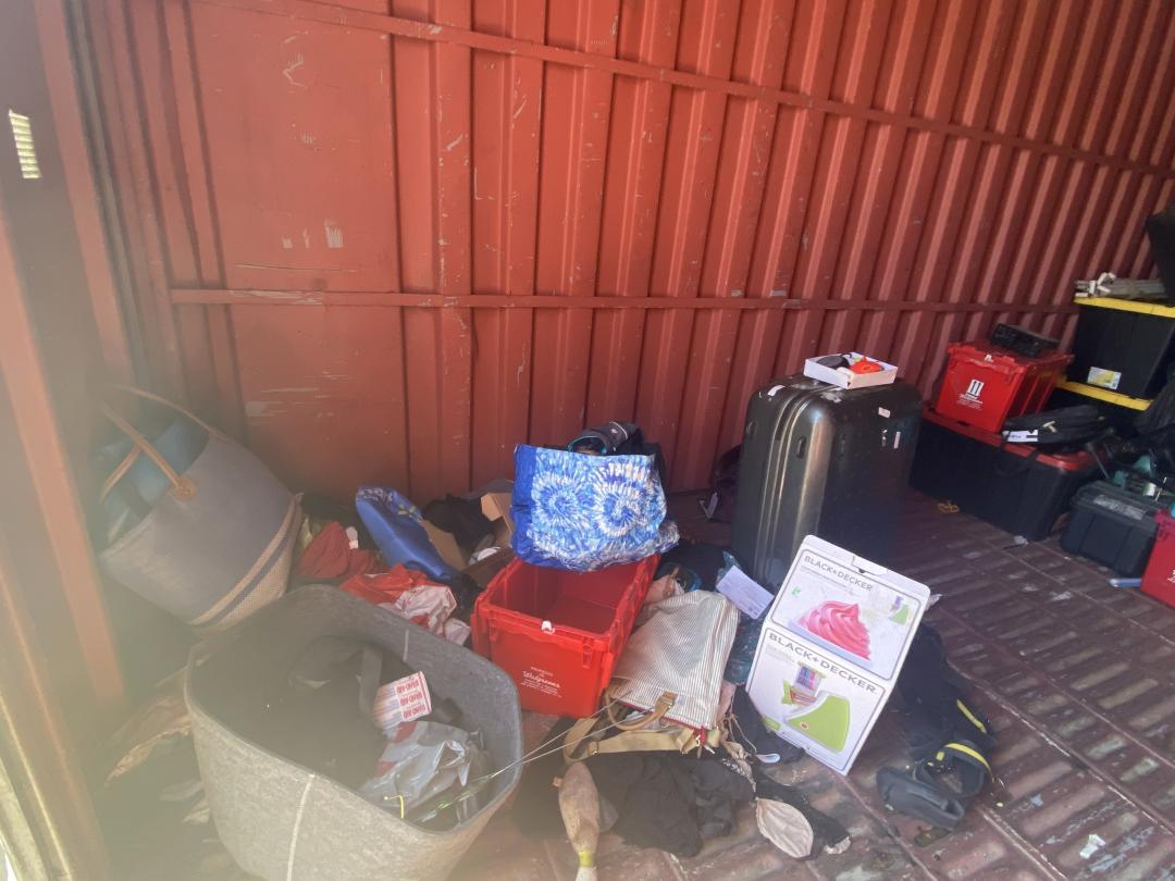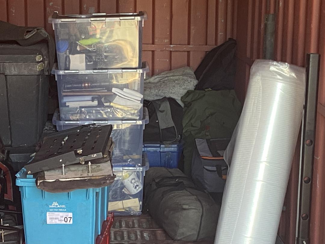 This unit appears to contain…Plastic Totes, Books, Luggage, Bags