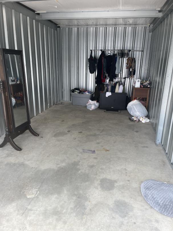 This unit appears to contain…Unit appears to contain standing mirror, clothing rack, TV, sewing machine, totes, clothes, etc.