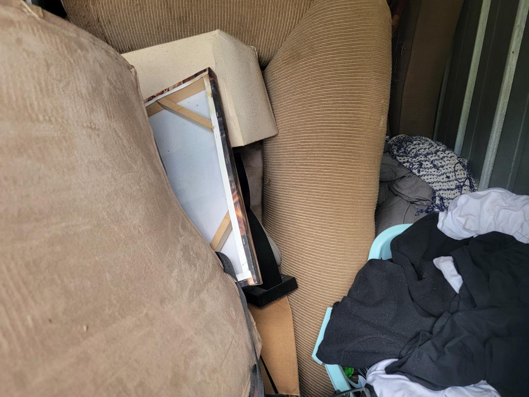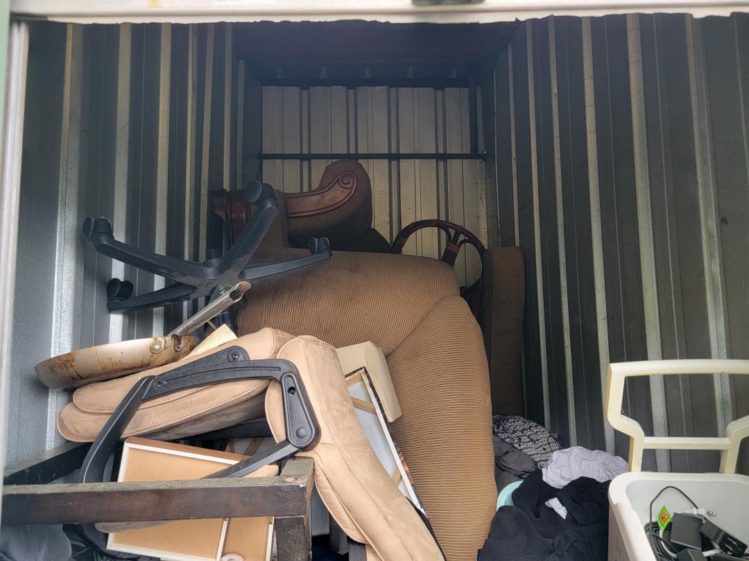 This unit appears to contain…household items, couch, tv, chairs, loveseat, clothes