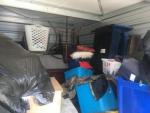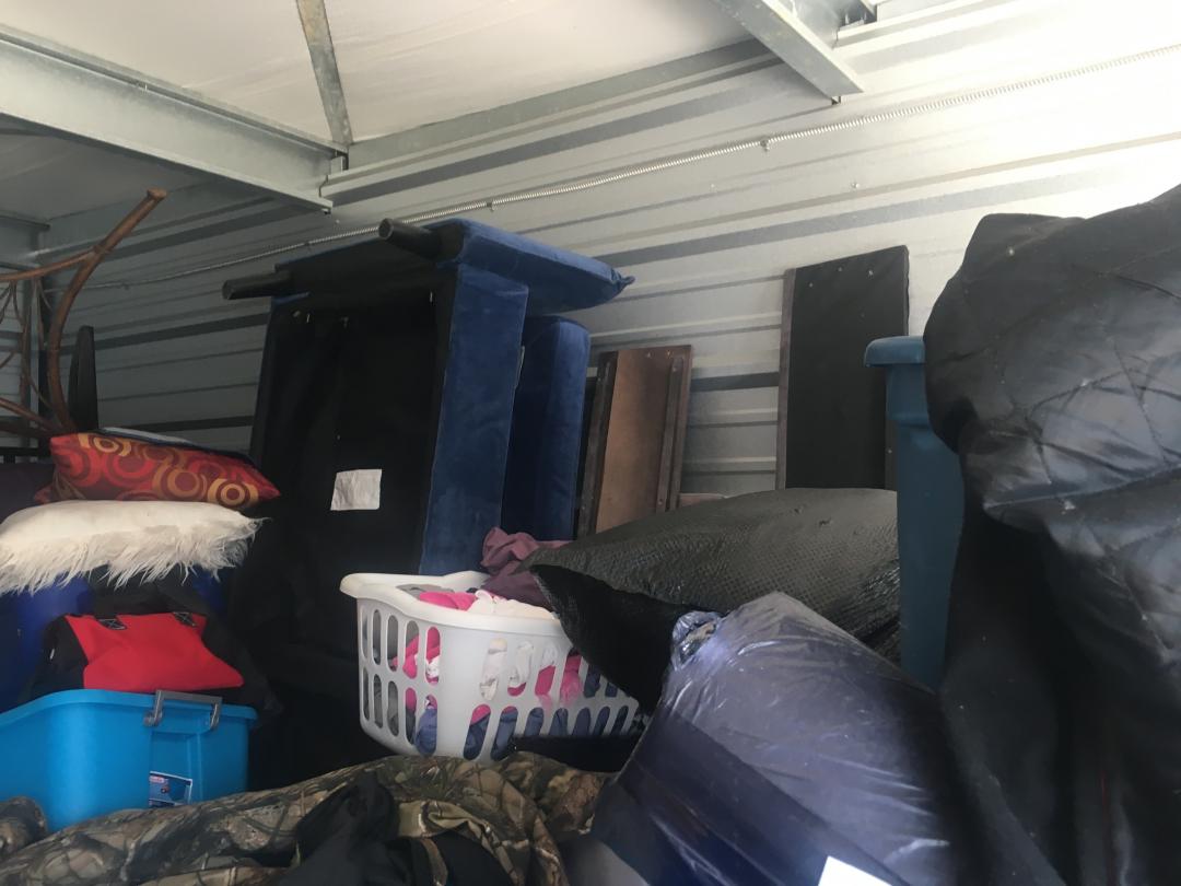 This unit appears to contain…blue velvet love seat, full bed, queen bed and box spring, wicker cocktail table, cooler, area rug, stove, storage roller bins, totes.