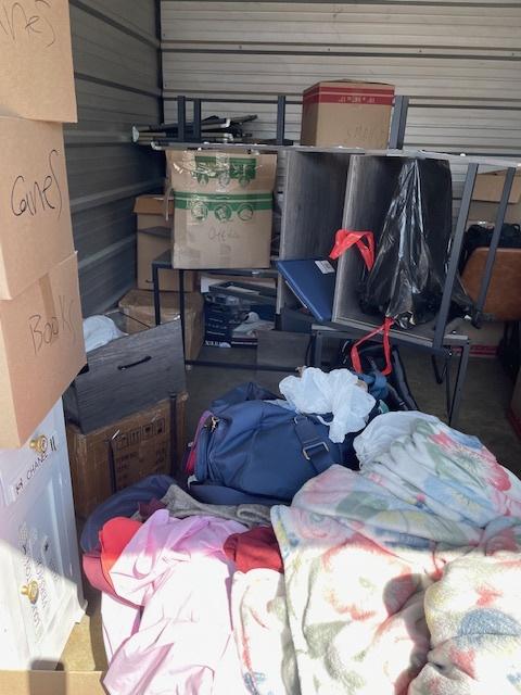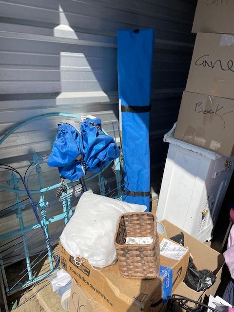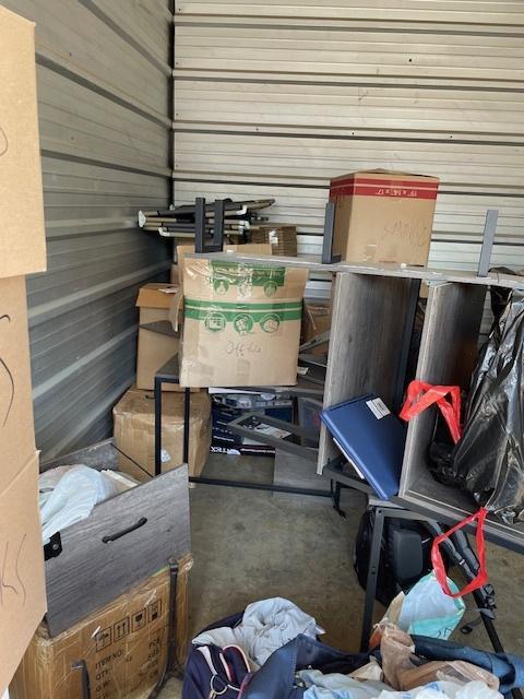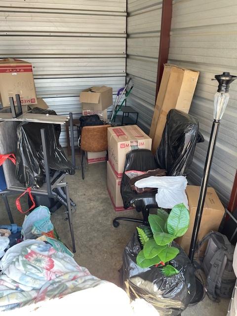This unit appears to contain…This 10x15 traditional unit appears to contain: Wooden Cabinet, 2-small yard fence, 10x10 canopy, lamp, sports folding chair, inflatable sofa, chest, tv trays, rubber hammer, fake plant, desk chair,, desk, folding lounge chair, end table, 2-back packs, plastic storage with drawers, bed linens, rolling cart, table lamp, extension cord, chair, misc totes, misc boxes, misc bags, small shelf and many hidden treasures.
