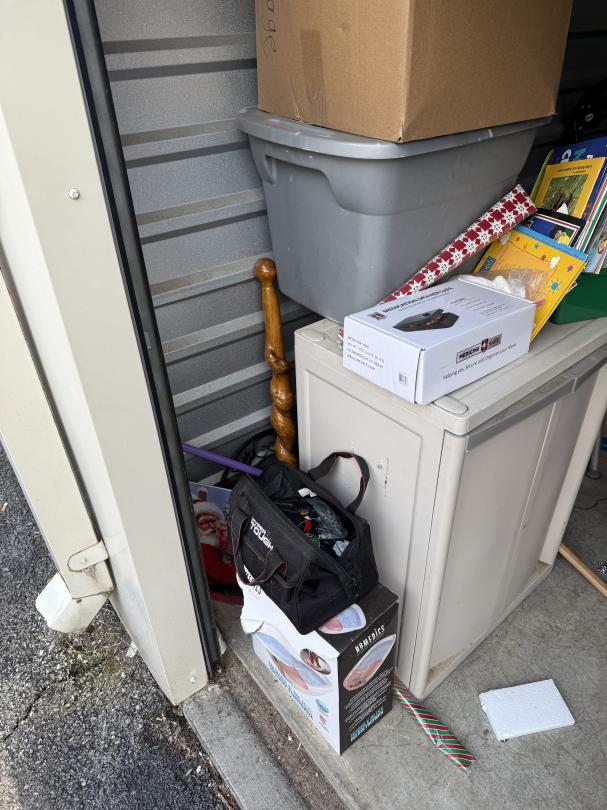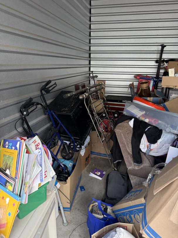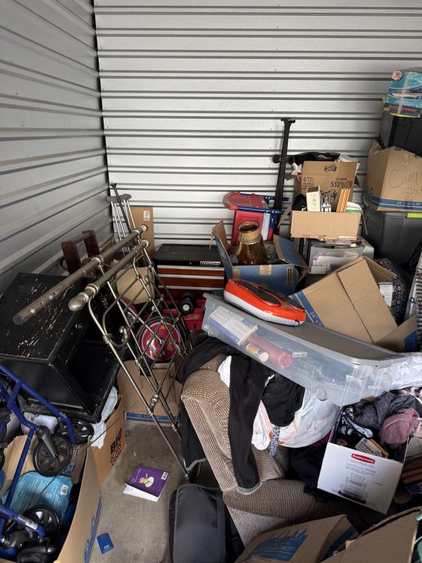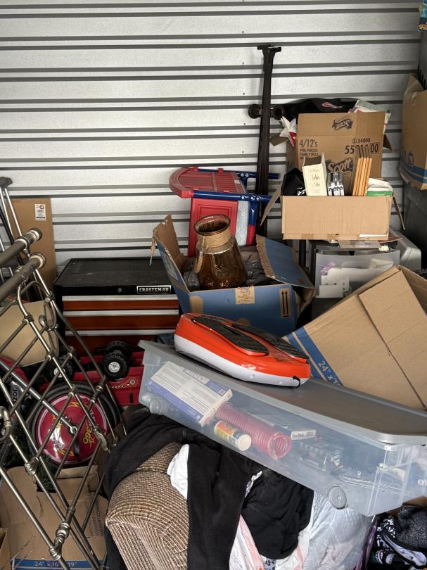 This unit appears to contain…clothing, shoes, medical walker, toolboxes, boxes, totes, kids toys, recliner, washing machine, dryer