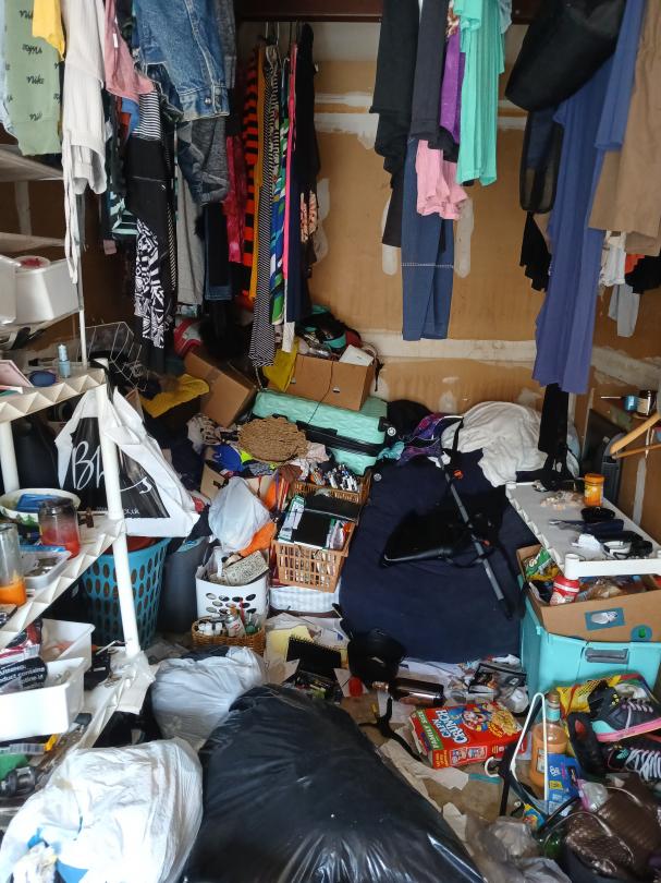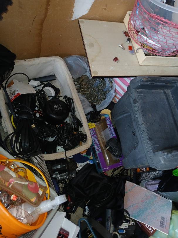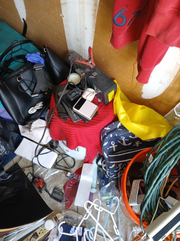 This unit appears to contain…Clothes, tools, cords, cell phones, purses, boxes, bags, dishes, shelves, watches, belts, blankets,suitcase,notebooks, paint,bike parts,baskets,battery charger