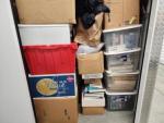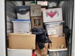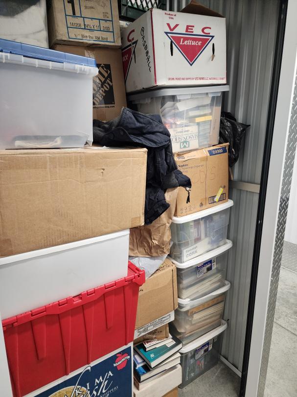 This unit appears to contain…Boxes, totes, coat, bag, books, towels