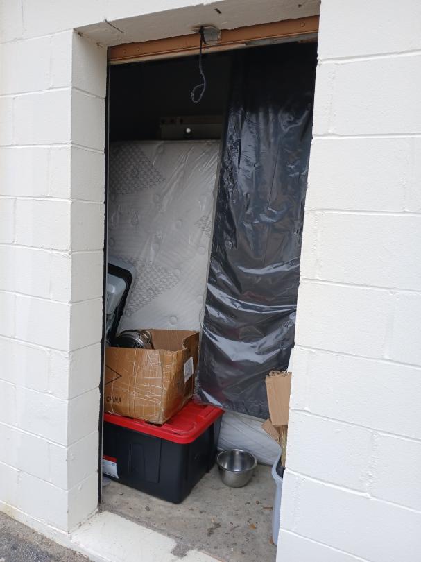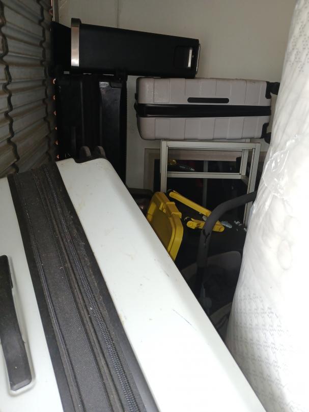 This unit appears to contain…box springs, mattress,suitcases, pots and pans, headboard, totes, pictures,