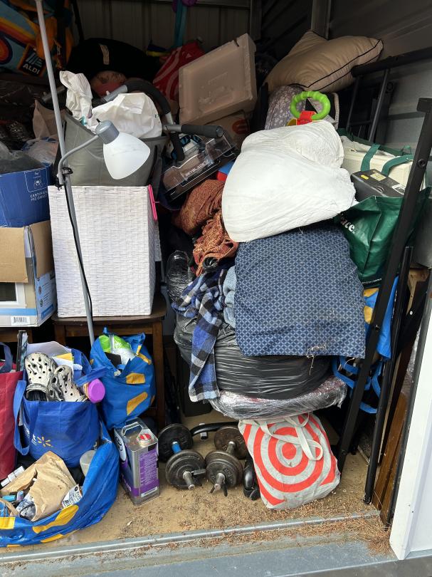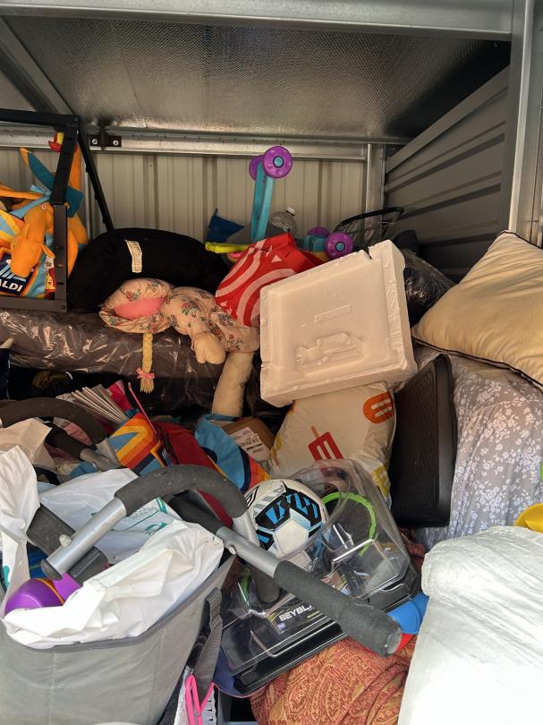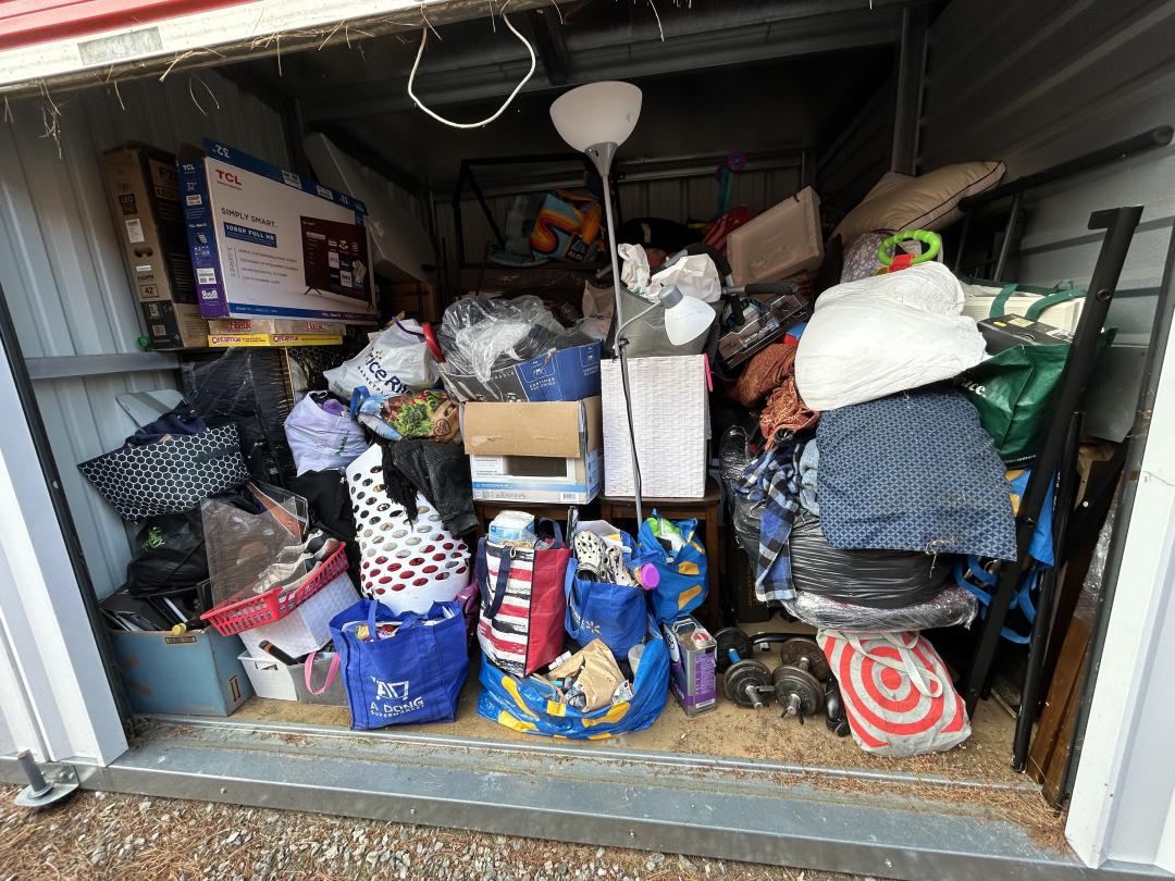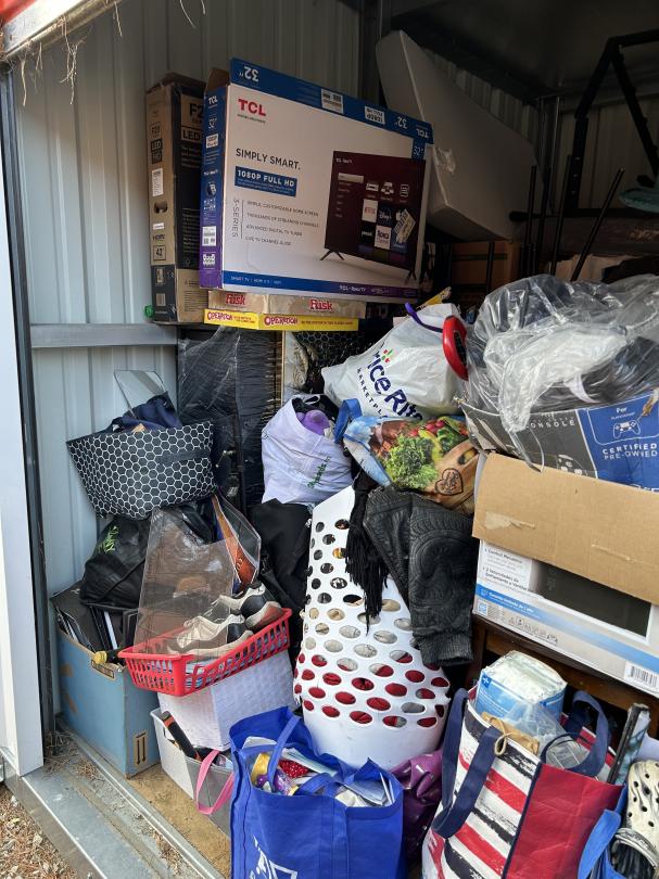 This unit appears to contain…READ ALL AUCTION RULES BEFORE BIDDING!!! Unit appears to contain: TV boxes, clothes, bags, boxes, shoes, dressers, board games, dumbbell weights, side table