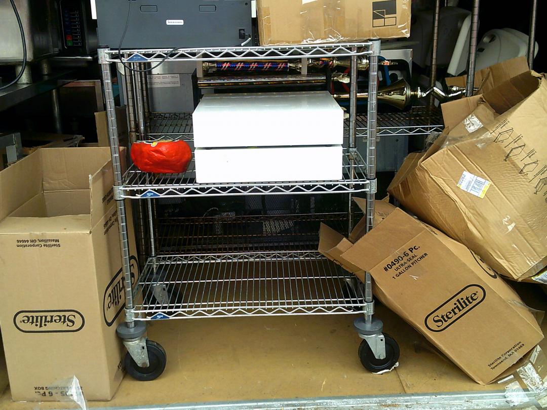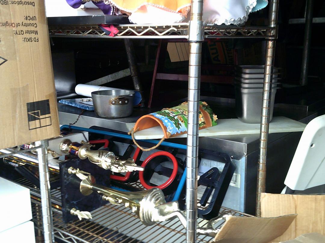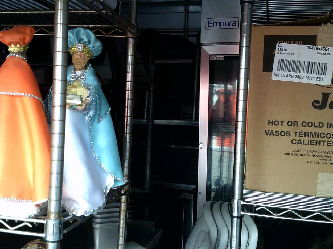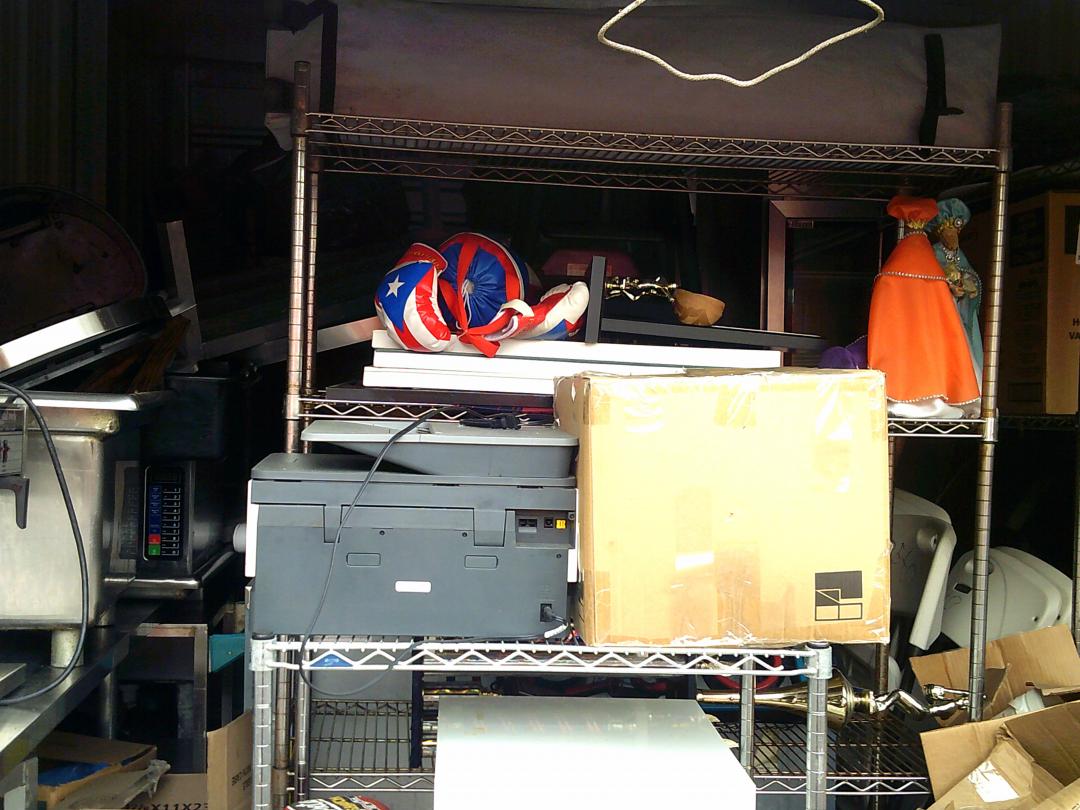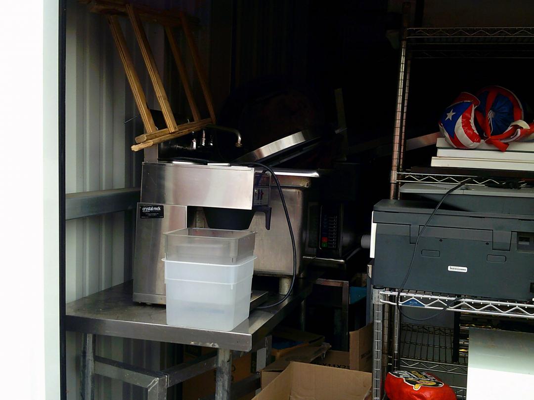 This unit appears to contain…READ ALL AUCTION RULES BEFORE BIDDING!!! Unit appears to contain: tables, sink, coffee maker, kitchen racks, TVs, fridge, folding chairs, wall art, kitchen utensils, highchair, printer, microwave, boxes, refrigerator deli prep stations, totes