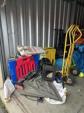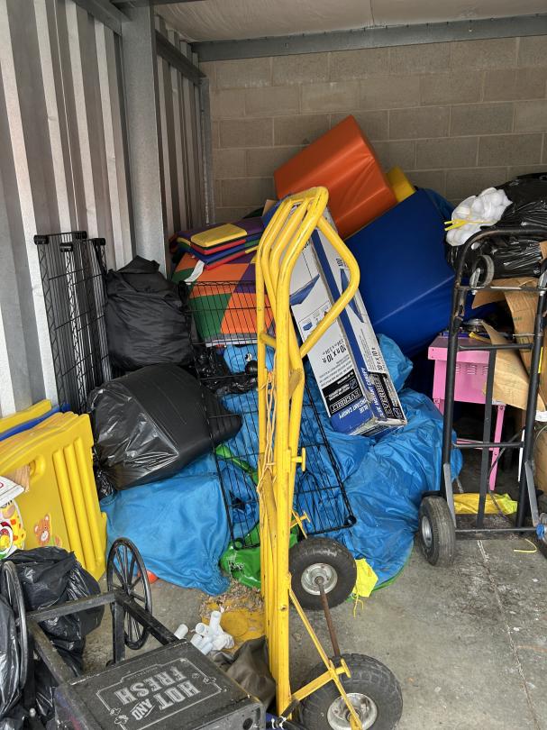 This unit appears to contain…READ ALL AUCTION RULES BEFORE BIDDING!!! Unit appears to contain: cotton candy machine, snow cone machine, popcorn machine, dollies, tire, boxes, pop up canopy, gymnastic mats, ladder, totes, rack