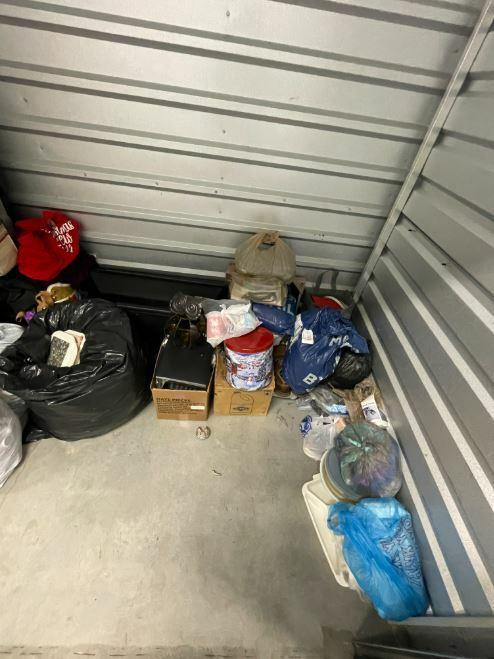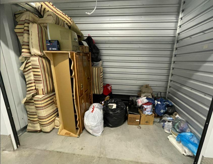 This unit appears to contain…couch, dresser, tv, bags, boxes, shoes, decor, kitchenware