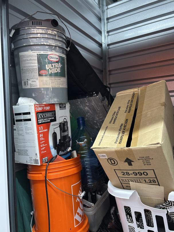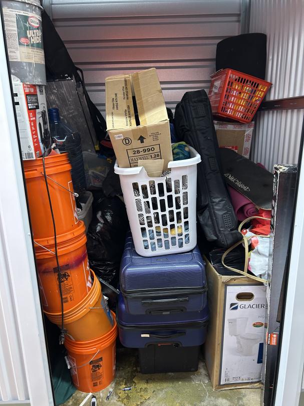 This unit appears to contain…READ ALL AUCTION RULES BEFORE BIDDING!!! Unit appears to contain: suitcases, totes, 5 gallon buckets, skateboard, scaffolding, TV, shoes, cleaning supplies, grow lights, laundry basket